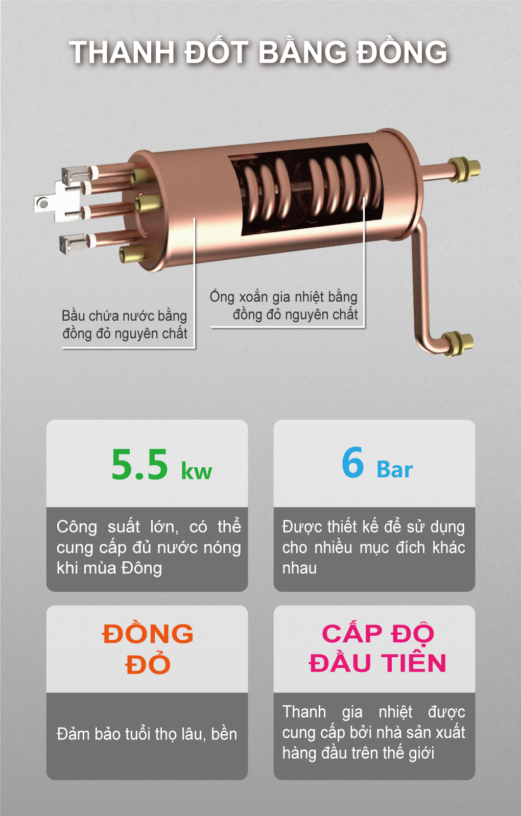- Bầu đun bằng đồng chịu áp lực cao, trái tim của bình nước nóng.