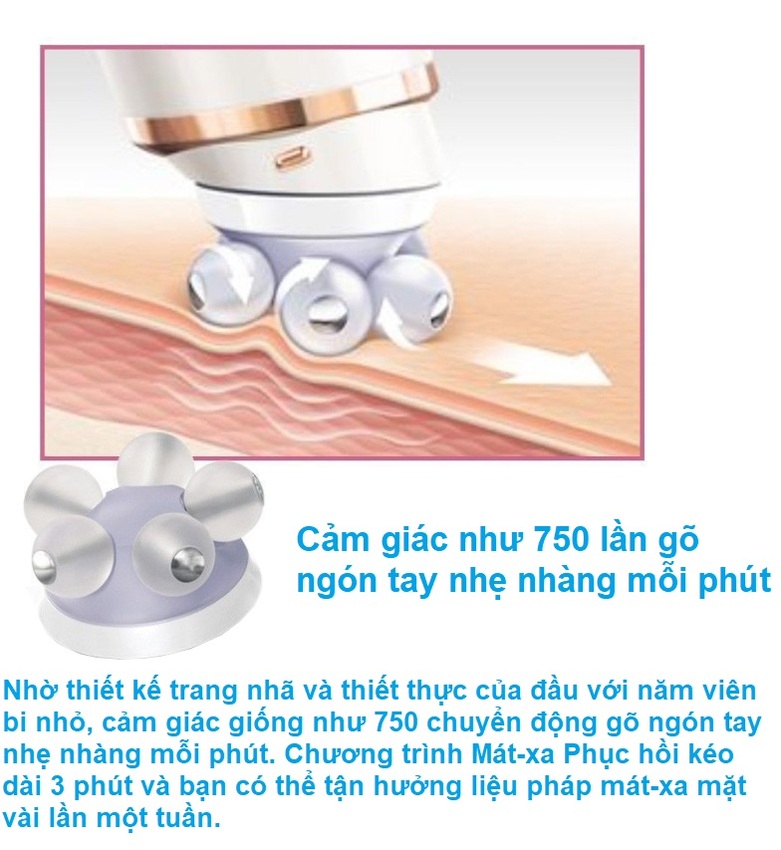 - Nhờ thiết kế trang nhã và thiết thực của đầu với năm viên bi nhỏ, cảm giác giống như 750 chuyển động gõ ngón tay nhẹ nhàng mỗi phút. Chương trình Mát-xa Phục hồi kéo dài 3 phút và bạn có thể tận hưởng liệu pháp mát-xa mặt vài lần một tuần Được phát triển bởi các chuyên gia massage Nhật Bản