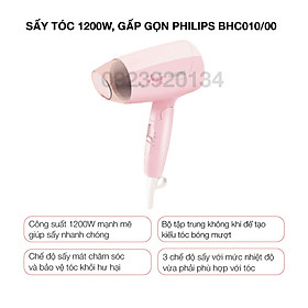 Máy sấy tóc Philips có công suất lớn 1200W Máy sấy tóc Philips BHC010/00 sở hữu thiết kế màu hồng xinh xắn, kiểu dáng nhỏ gọn, dễ sử dụng với tay cầm có thể gập lại, thuận tiện cho