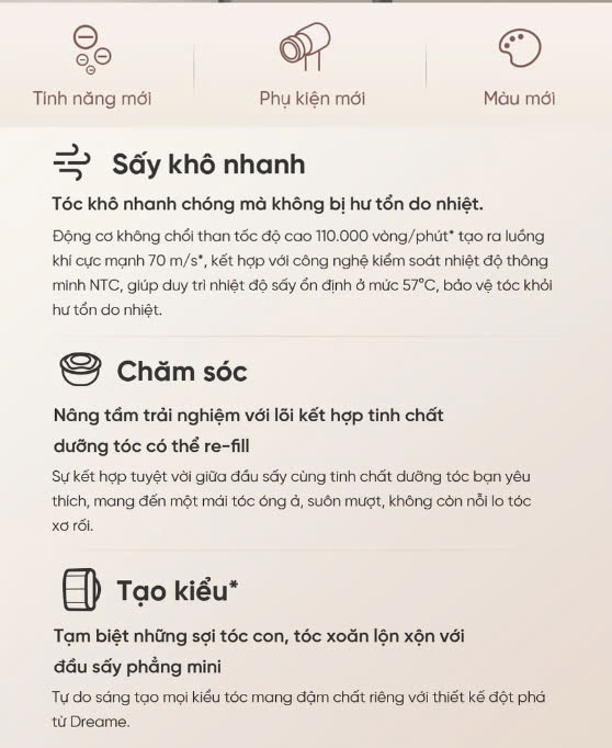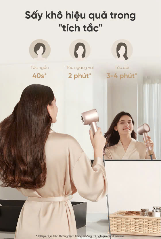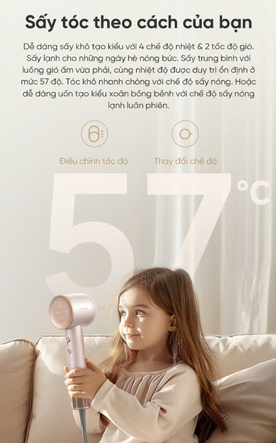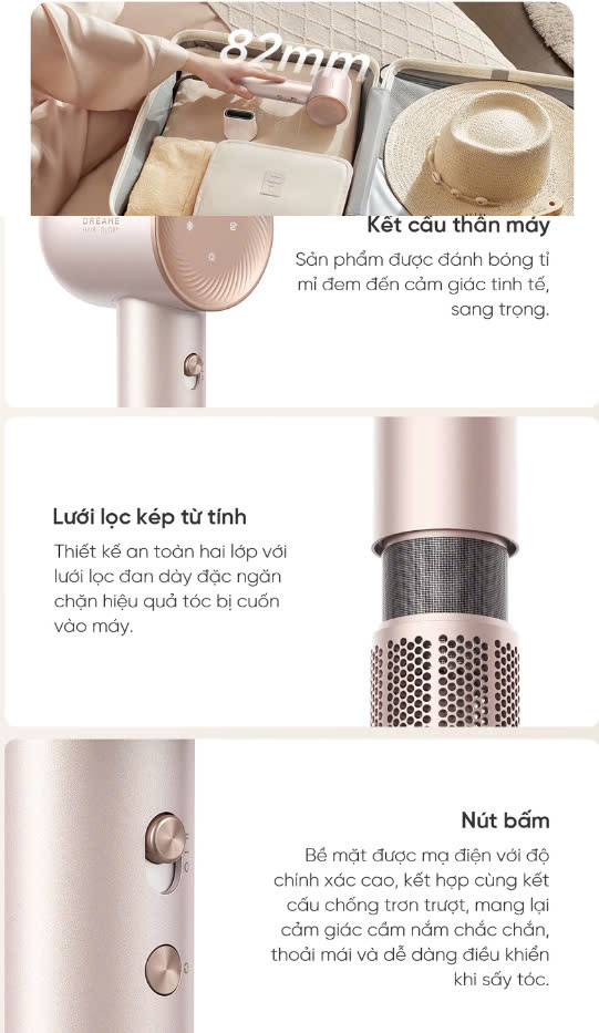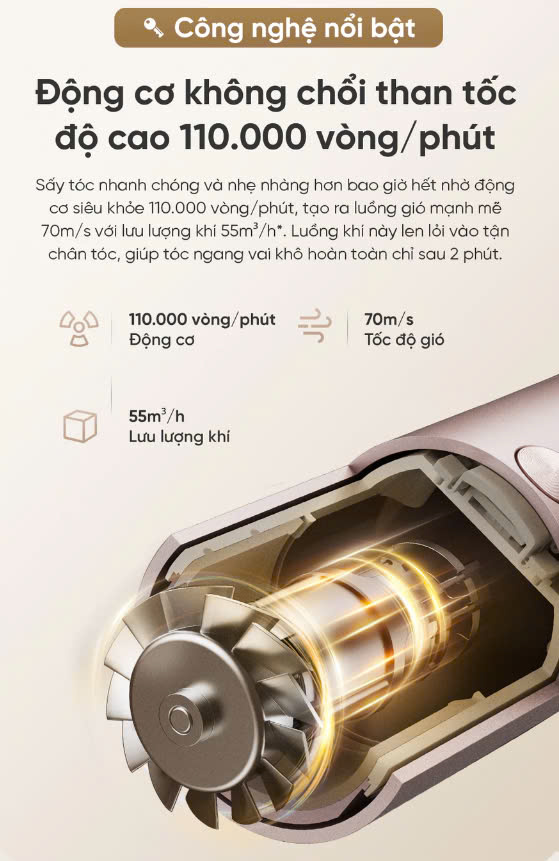 Động cơ không chổi than tốc độ cao 110.000 rpm, tốc độ gió 65m/s, làm khô tóc ngắn chỉ trong 40 giây Cảm biến kiểm soát nhiệt thông minh NTC, kiểm soát nhiệt độ 100