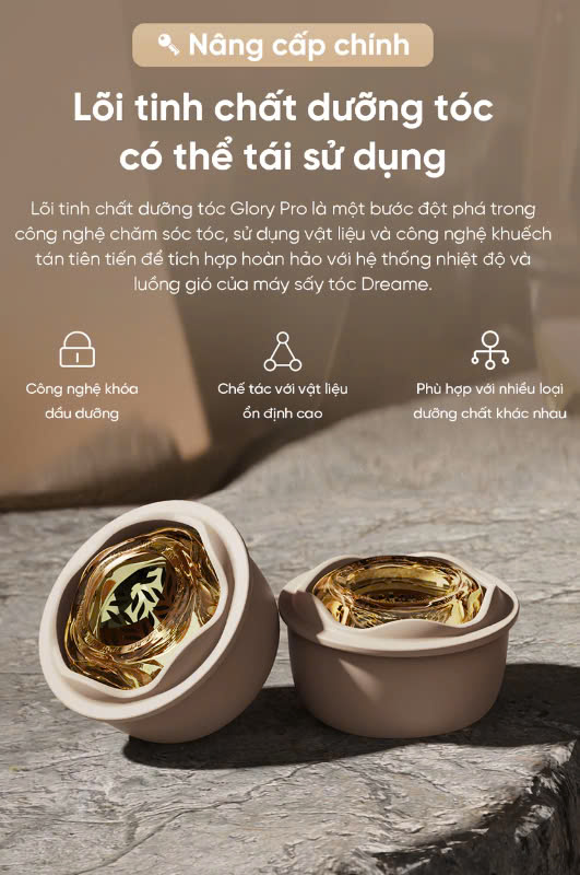 Hãy cùng sấy khô, nuôi dưỡng và chăm sóc mái tóc bóng mượt cùng Glory Pro. Với luồng gió mạnh mẽ, công nghệ ion âm tiên tiến, kết hợp với thiết kế gọn nhẹ, chip xử lý kiểm soát nhiệt độ thông minh, ngoài ra bổ sung đầu sấy kết hợp lõi tinh chất, Glory Pro không chỉ giúp mái tóc bạn được thổi khô nhanh chóng, mà còn giúp việc nuôi dưỡng chăm sóc trở nên đơn giản, tiện lợi, nhẹ nhàng. Thiết kế màn hình LED cao cấp, sang trọng giúp Glory Pro trở thành một phụ kiện thể hiện đẳng cấp, cùng gout thẩm mỹ tinh tế hiện đại của người dùng. Vẻ ngoài gọn nhẹ, dễ bảo quản, dễ dàng mang theo trong các chuyến du lịch công tác. Ngoài ra việc kết hợp đầu sấy với lõi tinh chất có thể re-fill giúp cá nhân hóa & nâng tầm trải nghiệm chắc sóc tóc của bạn, giúp bạn luôn tỏa sáng trong từng khoảnh khắc.