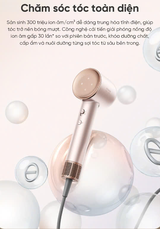 Kích cỡ nhỏ gọn, Tốc độ gió mạnh 30 triệu ion âm mang đến mái tóc mềm mại và bóng mượt Chăm sóc ion Công suất cao 1600 W để sấy khô nhanh Máy