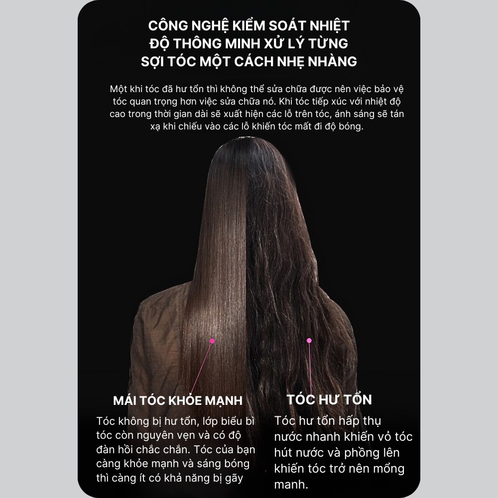 Động cơ không chổi than tốc độ cao 110.000 rpm, tốc độ gió 65m/s, làm khô tóc ngắn chỉ trong 40 giây Cảm biến kiểm soát nhiệt thông minh NTC, kiểm soát nhiệt độ 100