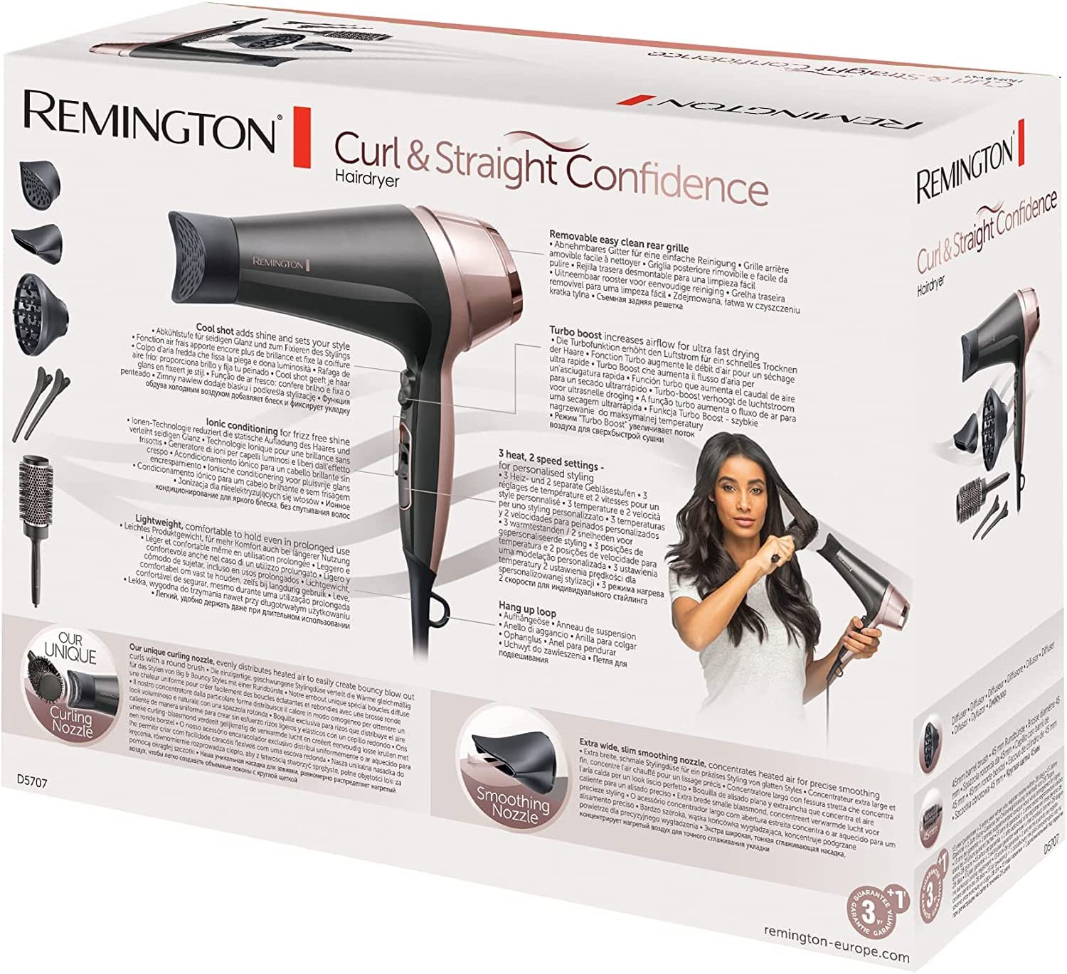 -Máy sấy tóc ion 2200W nhẹ và mạnh mẽ với màn hình LED, tạo ra nhiều ion hơn 90% (so với máy sấy tóc Remington tiêu chuẩn), giảm điện tích tĩnh của tóc và mang lại độ bóng sáng không thể so sánh được.
