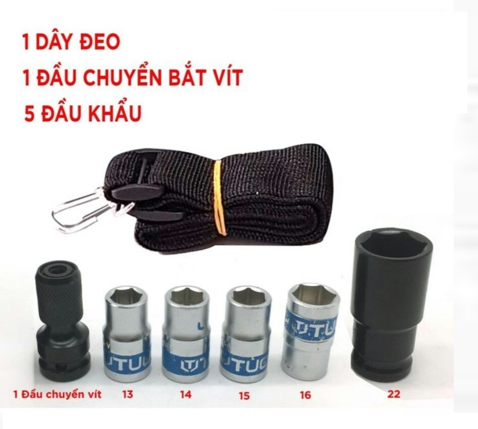 Phụ kiện bao gồm: 1 Thân máy, 2 pin, 1 sạc, 1 sách hướng dẫn, 1 hộp máy, 1 Mũi khoan bulong đầu siết 22mm, 1 đầu chuyển đổi từ khoan bulong sang bắt vít, 1 Mũi vít, 4 đầu siết bulong đủ kích cỡ, 1 đai đeo máy vào thắt lưng