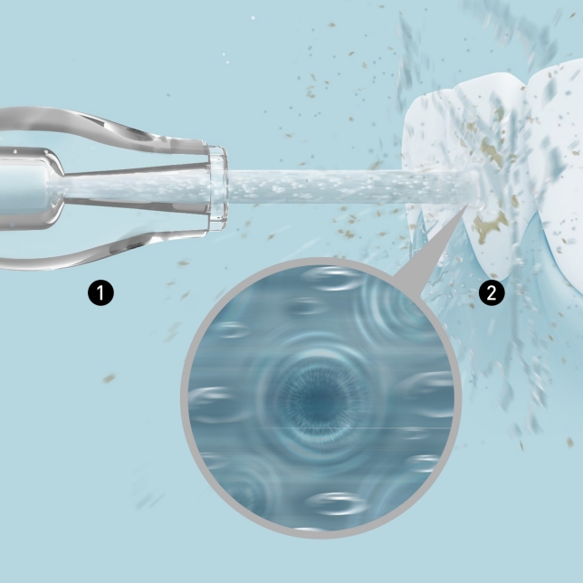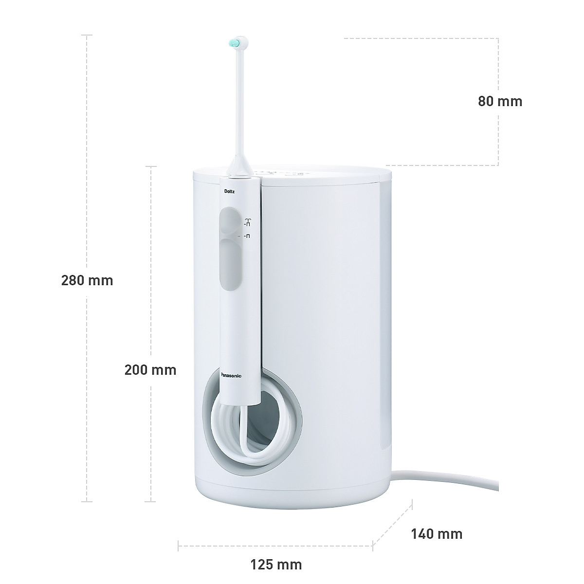 - Khi bọt nước vỡ ra, chúng sẽ tạo ra sóng xung kích tác động nhẹ lên nướu răng. Cùng với dòng nước, các bọt nước này giúp mảnh vụn thức ăn một cách cực kỳ hiệu quả thậm chí chỉ với cùng một mức áp lực nước. Làm sạch triệt để tất cả bề mặt răng Tia nước với công nghệ siêu âm giúp dễ dàng làm sạch bề mặt răng, kẽ răng, túi nha chu, chăm sóc nướu và chăm sóc dụng cụ chỉnh nha. Các tính năng tăng tính tiện dụng 3 phút sử dụng khi bình chứa nước đầy Bình chứa nước lớn 600 ml cho thời gian sử dụng dài (2 phút 10 giây sử dụng với đầu phun chỉnh nha.) Thời gian xấp xỉ. Khi sử dụng đầu phun siêu âm. Tay cầm nam châm Tay cầm lõi từ, kẹp giữ cáp giúp dễ dàng cất giữ. Khi cất giữ, phần dưới của tay cầm không chạm vào phần đáy nên luôn giữ được sạch sẽ. 10 mức áp lực nước tùy chọn Có thể điều chỉnh áp lực nước trong 10 nấc và cường độ dòng nước sử dụng lần cuối sẽ được thiết bị tự động ghi nhớ. Các tính năng tiện dụng khác Bình chứa có thể tháo rời Dễ dàng đổ đầy và bảo dưỡng, bình chứa có thể súc rửa được bằng máy. Chỉ riêng bình chứa, không tính các bộ phận khác của sản phẩm. Ổ cắm nguồn kép Hai khe để gài dây nguồn cho phép bạn rút dây từ cả hai bên trái và bên trái rất thuận tiện Tay cầm có thể rửa được Tay cầm có thể rửa bằng nước giúp dễ dàng bảo dưỡng. Thiết kế đơn giản và tinh tế Với thiết kế hình trụ đơn giản, màu trắng tạo cảm giác sạch sẽ và phù hợp với không gian xung quanh là nước. Thông số kỹ thuật Kích thước và trọng lượng Chiều cao: 285mm Chiều rộng: 125mm Chiều sâu; 140mm Trọng lượng: 995g