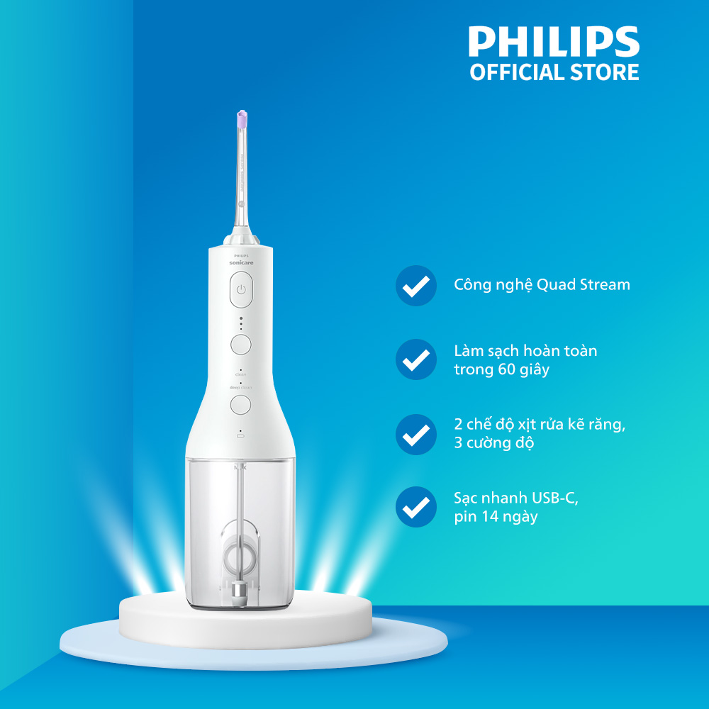 Làm sạch răng với công nghệ Quad Stream Đầu xịt Quad Stream được thiết kế độc đáo giúp làm sạch nhiều bề mặt răng hơn và ít tốn công sức hơn, làm sạch kỹ lưỡng kẽ răng để cải thiện sức khỏe nướu răng của bạn. Nhờ vậy, bạn có thể làm sạch răng bằng chỉ nha khoa đúng cách và đạt hiệu quả cao hơn mỗi khi sử dụng. THÔNG SỐ KỸ THUẬT: • Thương hiệu: Philips • Máy xịt rửa kẽ răng không dây: 1 • Đầu xịt tiêu chuẩn F1: 1 • Đầu xịt Quad Stream F3: 1 • Túi chứa: 1 • Dây cáp sạc pin USB: 1 • Bộ chuyển đổi USB gắn tường: 1 • Tay nắm: Thiết kế mảnh tiện dụng • Phụ tùng đầu xịt: Dễ dàng tháo lắp • Màu sắc: trắng • Xuất xứ: Trung Quốc HƯỚNG DẪN SỬ DỤNG VÀ BẢO QUẢN: • Tham khảo HDSD đi kèm máy. • Bảo quản máy nơi khô thoáng. PHILIPS CAM KẾT VỚI KHÁCH HÀNG: • Philips mang đến cho khách hàng những sản phẩm với chất lượng. • Dịch vụ khách hàng luôn tận tâm và nhiệt tình, giúp quý khách có được trải nghiệm hài lòng khi mua hàng. • Bảo hành quốc tế 2 năm.