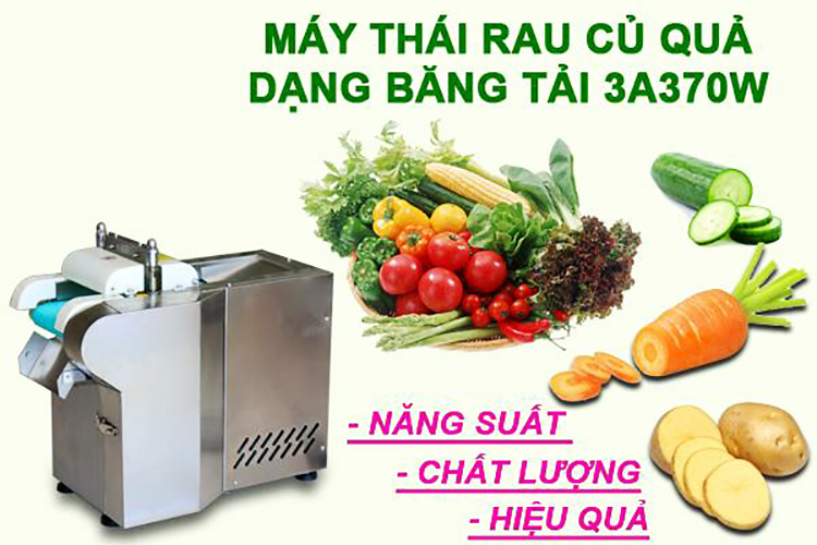 Máy thái lát rau củ quả dạng băng tải 3A370W có thể thái đa dạng các loại rau củ quả như khoai tây, khoai lang, cà rốt, dưa chuột (dưa leo), củ cải, các loại rau xanh, cắt hành lá