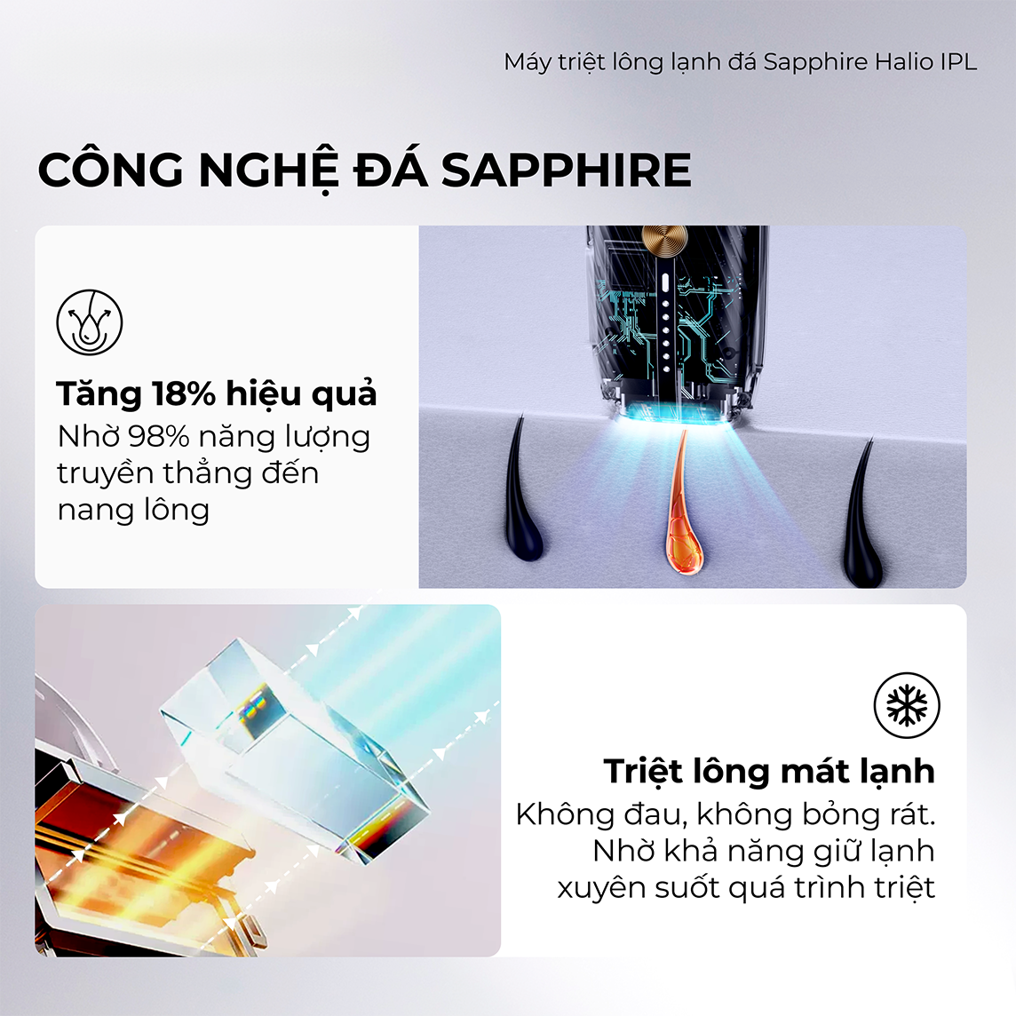 (*) Máy Triệt Lông Halio InfinityGlow Advanced IPL Sapphire Cooling là người bạn đồng hành lý tưởng, mang đến cho bạn làn da mịn màng và rạng rỡ. Được thiết kế với ba chế độ