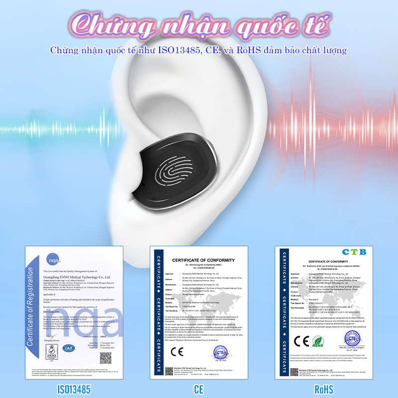 Sản phẩm đạt chất lượng ISO13485,CE、RoHS Ưu điểm của tai nghe trợ thính không dây Funmic EN-IA006A: Âm thanh tái tạo sắc nét Tai nghe trợ thính Funmic EN-IA006A được trang bị chip xử lý âm thanh hiện đại, giúp tái tạo âm thanh một cách sắc nét và trung thực. Nhờ công nghệ tiên tiến, người dùng có thể nghe rõ từng âm thanh với độ chính xác cao, dù là trong môi trường ồn ào hay yên tĩnh. Lọc bỏ tiếng ồn ≤29dB Với khả năng lọc bỏ tiếng ồn ≤29dB, tai nghe này giúp loại bỏ hiệu quả các tạp âm không mong muốn từ môi trường xung quanh, cho phép người dùng nghe rõ hơn các âm thanh quan trọng của cuộc trò chuyện hay âm thanh từ cuộc sống. Độ méo tiếng cực nhỏ 5% Một trong những ưu điểm nổi bật của máy trợ thính không dây Funmic EN-IA006A là độ méo tiếng rất thấp, chỉ 5%. Đảm bảo chất lượng âm thanh gần với âm thanh thực tế nhất, mang lại cảm giác nghe dễ chịu và tự nhiên. Mạch khuếch đại Class D Tai nghe trợ thính Funmic EN-IA006A sử dụng mạch khuếch đại Class D, cho hiệu suất cao và tiết kiệm năng lượng. Điều này giúp âm thanh được khuếch đại mạnh mẽ, rõ ràng mà không tiêu tốn quá nhiều pin. Ghi nhớ âm lượng thông minh Với chức năng ghi nhớ âm lượng, người dùng không cần điều chỉnh lại mức âm lượng sau mỗi lần tắt máy. Tai nghe trợ thính Funmic EN-IA006A sẽ tự động ghi nhớ và điều chỉnh theo cài đặt trước đó, giúp tiết kiệm thời gian và tạo sự tiện lợi. Khử tiếng hú, tiếng gió hiệu quả Chức năng lọc tiếng hú nhanh kết hợp với bộ lọc âm thanh có thể chặn tiếng hú, tiếng gió hiệu quả. Thiết kế này giúp mang lại trải nghiệm nghe thoải mái, không gây cảm giác khó chịu cho tai, đặc biệt khi sử dụng ngoài trời hoặc trong môi trường nhiều tiếng động. Độ trễ âm thanh <15ms Với độ trễ âm thanh cực thấp chỉ <15ms, máy trợ thính Funmic EN-IA006A đảm bảo việc truyền âm thanh vào tai nhanh chóng. Điều này đặc biệt quan trọng khi giao tiếp, giúp người dùng không bị gián đoạn hoặc lỡ nhịp trong các cuộc trò chuyện. Âm thanh khuếch tán 360 độ Tai nghe trợ thính Funmic EN-IA006A hỗ trợ khuếch tán âm thanh 360 độ, giúp âm thanh được phân bổ đều khắp không gian nghe. Điều này mang lại cảm giác rõ ràng, sống động và giúp người dùng dễ dàng nhận diện âm thanh từ mọi phía. Nút tai silicon thân thiện với da Sản phẩm đi kèm 3 nút tai silicon mềm mại, thân thiện với da, đảm bảo sự thoải mái khi đeo trong thời gian dài mà không gây kích ứng hay đau tai. Thiết kế này phù hợp với nhiều kích thước tai khác nhau, giúp người dùng cảm thấy dễ chịu hơn khi sử dụng. Màn hình LED hiển thị % pin Tai nghe trợ thính Funmic EN-IA006A được trang bị màn hình kỹ thuật số, giúp người dùng dễ dàng quan sát % pin còn lại và có kế hoạch sạc pin kịp thời. Đây là tính năng tiện ích, giúp người dùng không bị gián đoạn trong quá trình sử dụng. Điều khiển cảm ứng vân tay Sản phẩm tích hợp bảng điều khiển cảm ứng vân tay, cho phép người dùng tùy chỉnh âm lượng một cách nhanh chóng và dễ dàng chỉ bằng những thao tác đơn giản. Thiết kế này mang lại sự hiện đại và tiện lợi khi sử dụng. Thời lượng pin dài 20 giờ Với thời lượng pin lên đến 20 giờ, tai nghe trợ thính Funmic EN-IA006A cho phép người dùng thoải mái sử dụng suốt cả ngày mà không cần lo lắng về việc hết pin. Đây là ưu điểm nổi bật giúp sản phẩm phù hợp với những người có nhu cầu sử dụng lâu dài. Thiết kế gọn nhẹ, đẹp mắt Sản phẩm có thiết kế gọn nhẹ, không gây nặng tai hay khó chịu khi đeo trong thời gian dài. Với trọng lượng siêu nhẹ và kiểu dáng hiện đại, người dùng có thể thoải mái mang theo tai nghe bất cứ lúc nào, bất cứ nơi đâu. Sạc chạm thông minh với hộp sạc Tai nghe trợ thính Funmic EN-IA006A đi kèm hộp sạc thông minh, giúp việc sạc pin trở nên nhanh chóng và tiện lợi. Hộp sạc này không chỉ giúp bảo vệ tai nghe mà còn đóng vai trò như một nguồn năng lượng dự phòng, đảm bảo tai nghe luôn sẵn sàng sử dụng. Đạt chứng nhận ISO13485, CE, RoHS Sản phẩm đạt các chứng nhận quốc tế như ISO13485, CE, và RoHS, đảm bảo chất lượng và an toàn cho người sử dụng. Những chứng nhận này khẳng định sản phẩm đáp ứng đầy đủ các tiêu chuẩn nghiêm ngặt về thiết bị y tế và thân thiện với môi trường. Đối tượng nào nên dùng máy trợ thính?