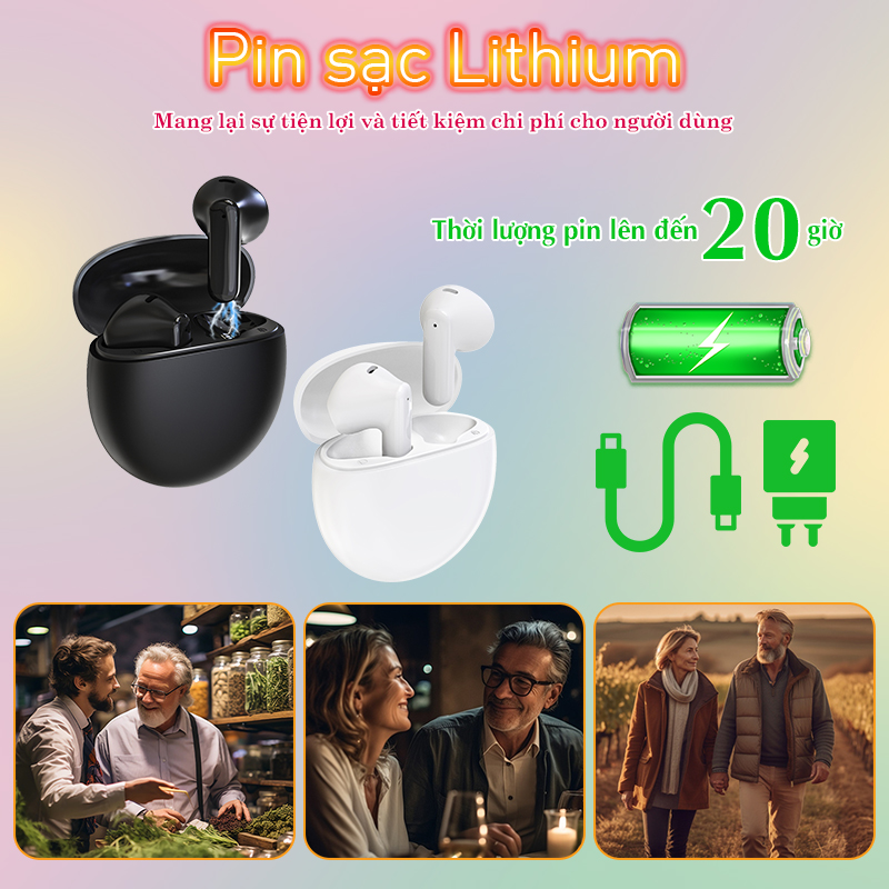 Thời gian sạc là 1-2 giờ. Thời gian hoạt động 17-20 giờ Sạc pin hộp sạc