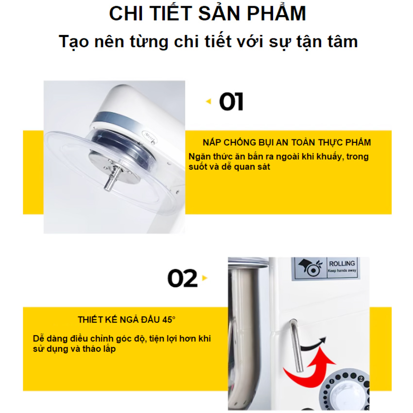 Động cơ 375W êm ái nhưng mạnh mẽ 4 mức tốc độ. Thêm nút quay nhanh Thích hợp sử dụng bằng tay phải hoặc trái Dễ vệ sinh Có nút nhả cho thanh đánh trứng