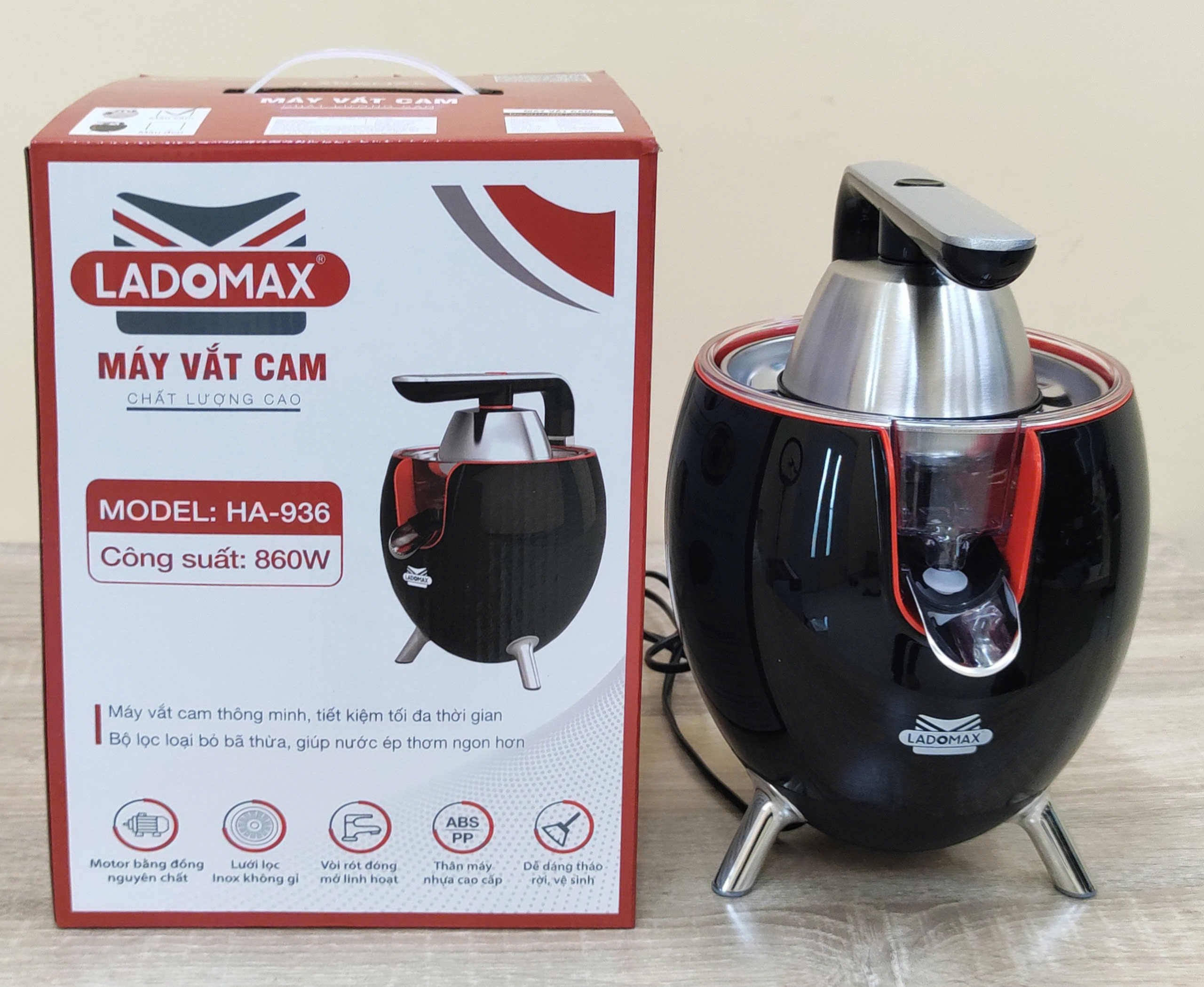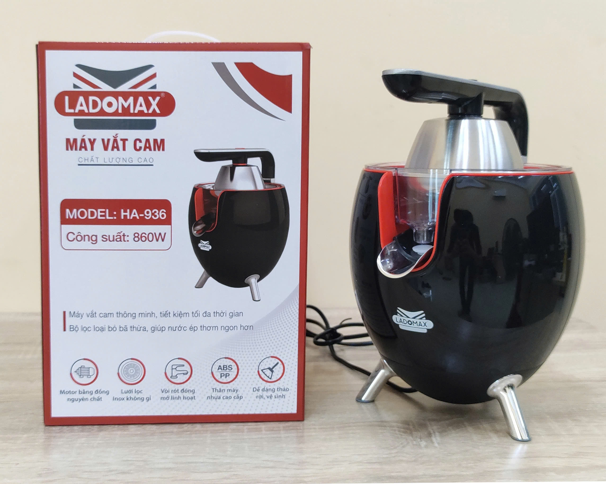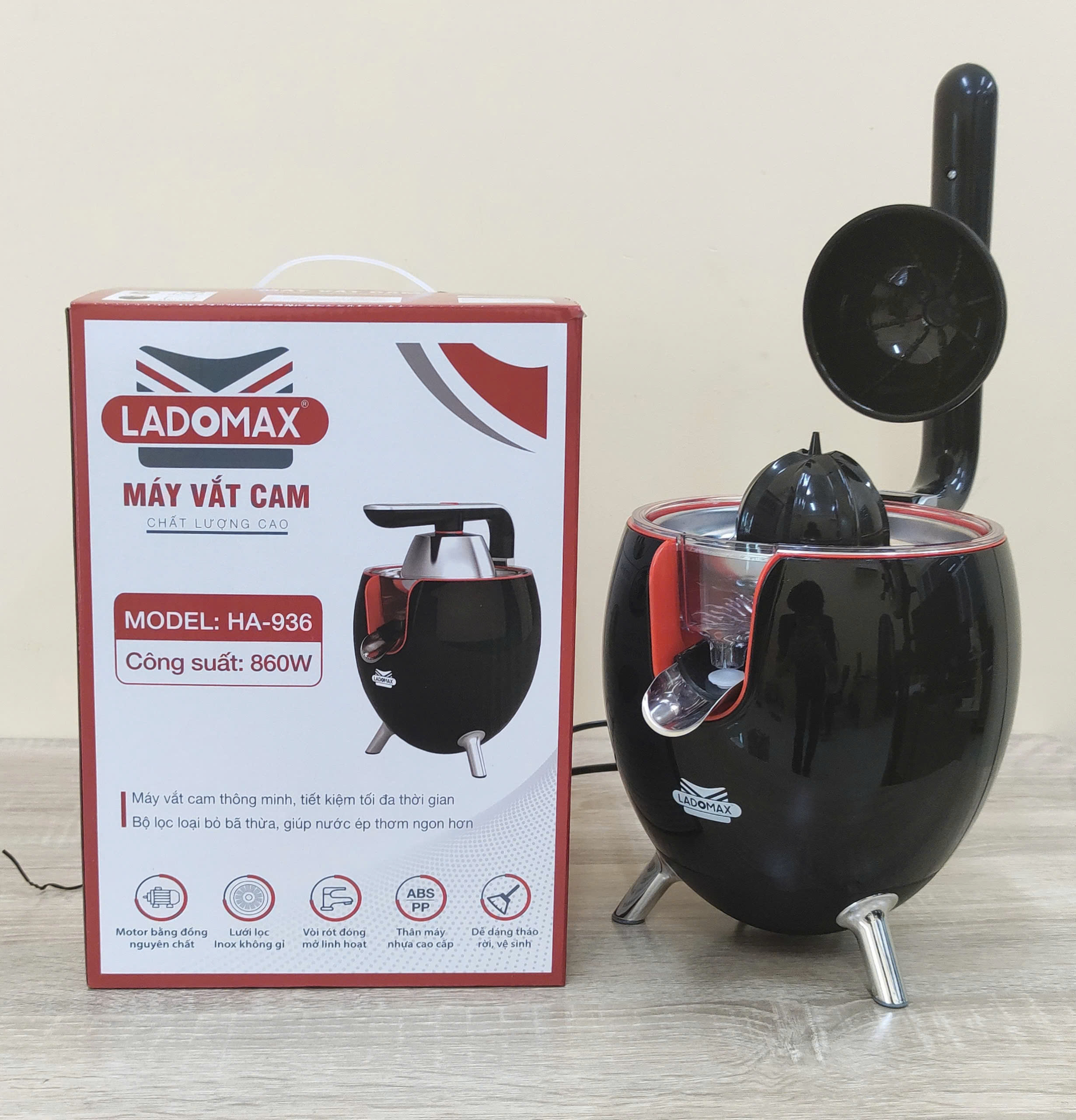 Thông tin sản phẩm   Thương hiệu Ladomax chính hãng   Máy: Máy vắt cam công nghiệp   Công suât: 860W   Model : 936 màu đen   Điện áp: 220-240V, 50/60HZ   Bảo hành