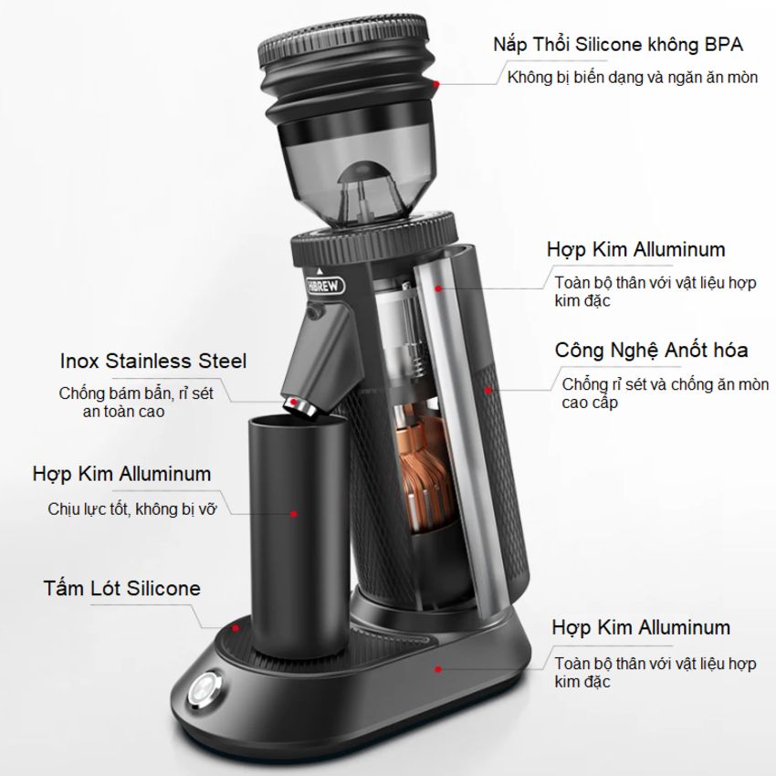 - MÁY XAY CÀ PHÊ HIBREW G5 - SINGLE DOSE sẽ là 1 lựa chọn hoàn hảo cho những ai đam mê cà phê thứ thiệt. Với việc sở hữu hàng loạt các đặc điểm nổi trội hiệu quả Chức năng điều chỉnh độ mịn cà phê
