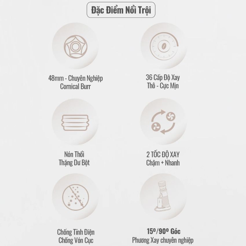 - Với lưỡi dao chất liệu thép không gỉ SS420 bền bỉ bền bỉ sở hữu 36 cấp độ xay, từ dạng thô đến dạng mịn. Chính vì thế nó có thể đáp ứng tối thiểu độ mịn cho 1 ly cà phê espresso chuẩn Ý. Thông số kỹ thuật