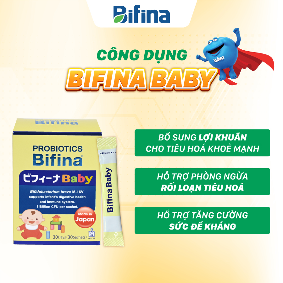 Men vi sinh Bifina Baby Nhật Bản – Hỗ trợ phòng ngừa rối loạn tiêu hoá, táo bón cho bé - Hộp 30 gói Đối tượng sử dụng: Dành cho trẻ em từ 0 tháng tuổi cần bổ sung lợi khuẩn cho hệ tiêu hóa khỏe mạnh. Công dụng : Bổ sung lợi khuẩn, giúp hệ vi sinh đường ruột khỏe mạnh, hỗ trợ tiêu hóa và tăng cường sức đề kháng. Thành phần mỗi gói (1g):