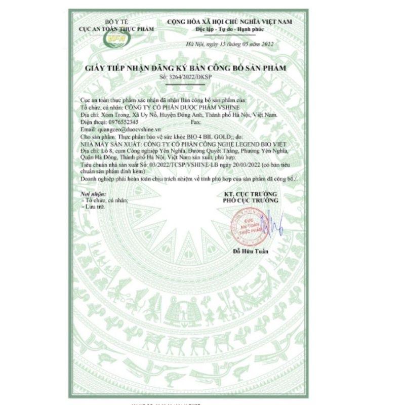 Bio 4 Bil Gold được cấp phép bởi Cục ATTP – Bộ Y tế với công dụng hỗ trợ giảm các triệu chứng do loạn khuẩn đường ruột