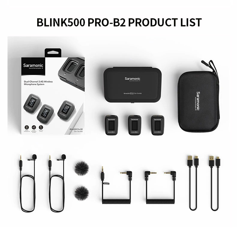 Saramonic Blink500 Pro B2 Saramonic Blink 500 Pro B2(TX+TX+RX) là bộ Microphone không dây tiện dụng, nhẹ, nhỏ gọn, dùng cho máy ảnh DSLR, Mirrorless và máy quay phim, hoặc các thiết bị di động, mang