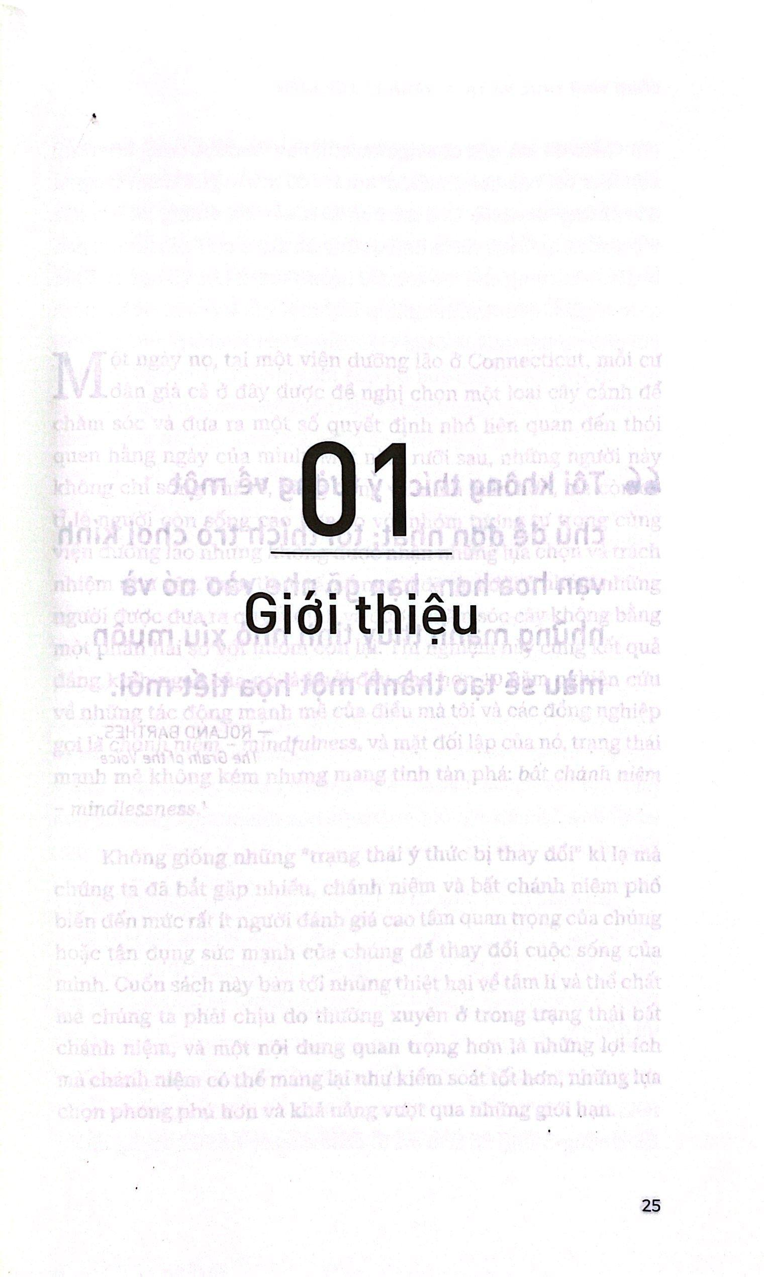 Chương 2 xem xét bản chất của bất chánh niệm và so sánh với các khái niệm tương tự như thói quen và vô thức. Chương 3 khám phá nguyên nhân của tình trạng bất chánh niệm, bao gồm vai trò quan trọng của bối cảnh và bản chất của những gì chúng ta tiếp nhận khi còn nhỏ. Tổng quan về cái giá phải trả cho sự bất chánh niệm, những giới hạn mà nó gây ra đối với các kĩ năng cũng như kì vọng và tiềm năng của chúng ta là nội dung của chương 4. Chương 5, thảo luận về bản chất của chánh niệm và so sánh với các khái niệm liên quan trong triết học phương Đông. Các chương từ 6 đến 10 trình bày về những ứng dụng của nghiên cứu chánh niệm trong năm khía cạnh lớn của cuộc sống thường ngày: quá trình lão hoá, sự sáng tạo, công việc, vấn đề định kiến và sức khỏe.