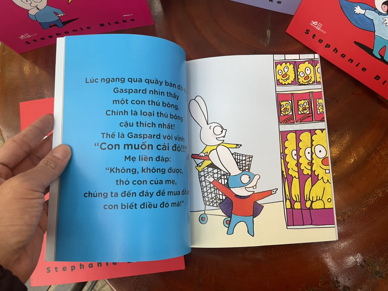 ✨(Minh hoạ màu – Bộ 5 cuốn) SIÊU THỎ - Có một em bé trong bụng mẹ, Con muốn cái đó, Con muốn ăn mì, Em bé cưng, Ứ đi nha sĩ đâu - Stephanie Blake – Măng dịch - Nhã Nam
