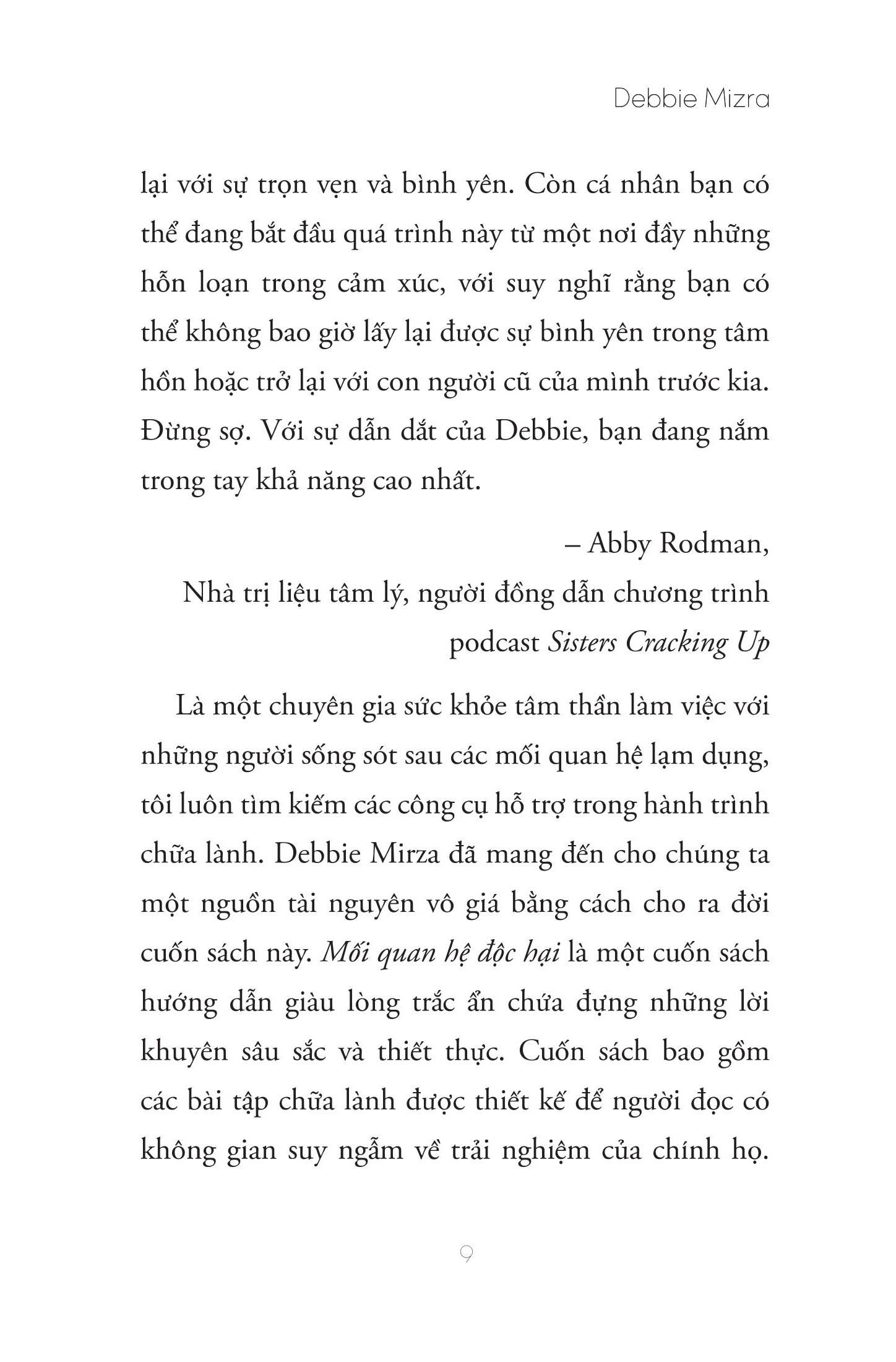 Mối Quan Hệ Độc Hại “Mối quan hệ độc hại” của tác giả Debbie Mirza là cuốn sách chia sẻ về hành trình chữa lành của những người bị lạm dụng bởi kẻ mắc chứng rối loạn ái kỷ. Cuốn sách sẽ tập trung vào các dấu hiệu để nhận biết một mối quan hệ độc hại đồng thời đưa ra những liệu pháp, hành trình phục hồi, cách tự chữa lành để bạn có thể tìm được tự do, sự bình yên trong cuộc sống của của m.ình. Cuốn sách sẽ giúp bạn xoa dịu những tổn thương, mất mát dù nhỏ hay lớn mà bạn gặp phải trong các mối quan hệ lạm dụng hoặc thao túng suốt những năm qua bởi cuốn sách sẽ cho bạn biết: