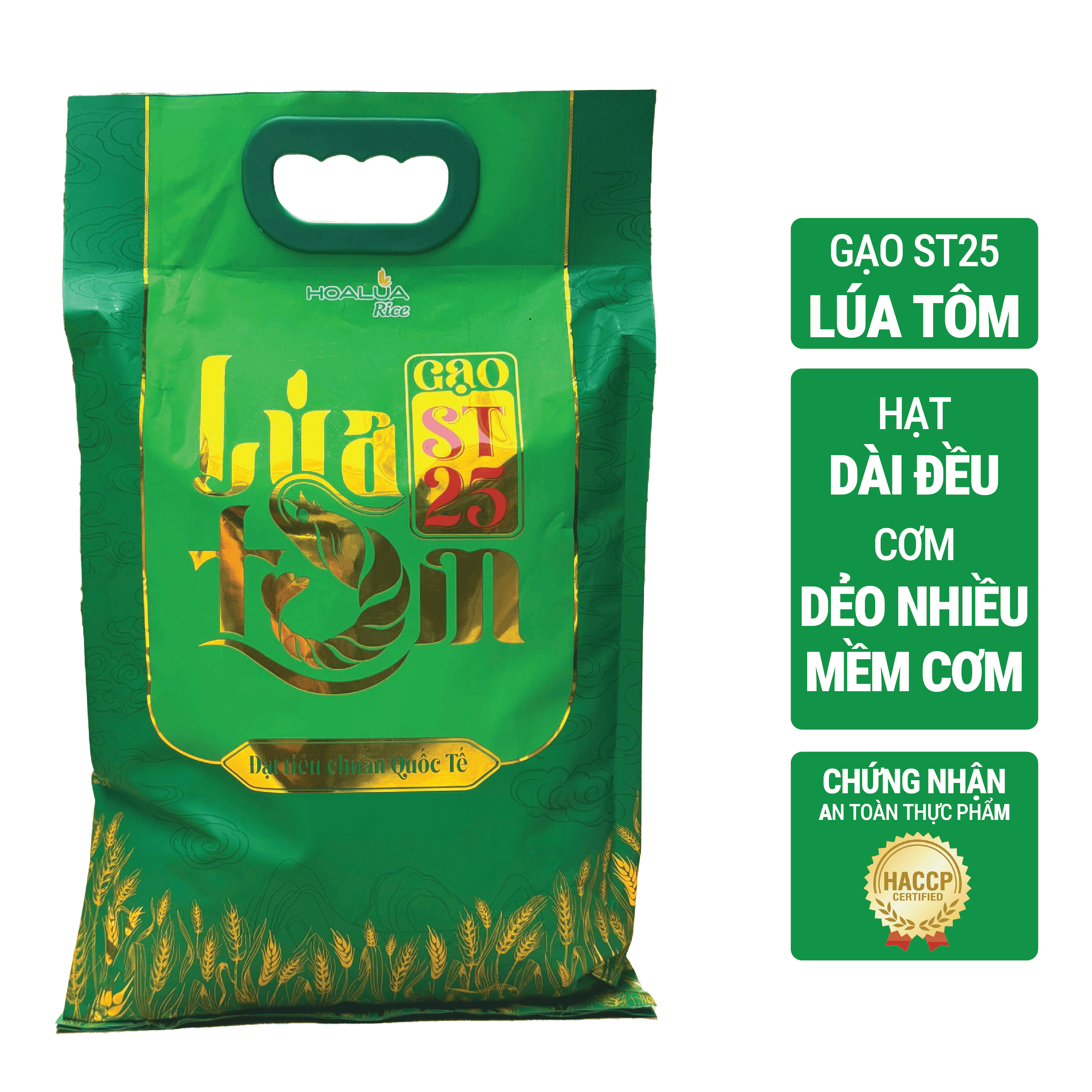 Gạo ST25 Lúa Tôm chính hãng Ông Cua Sóc Trăng túi 5kg có hạt dài, trắng trong, không bạc bụng, khi nấu cơm dẻo thơm, khi để nguội cơm vẫn ngon, không bị cứng. Hàm