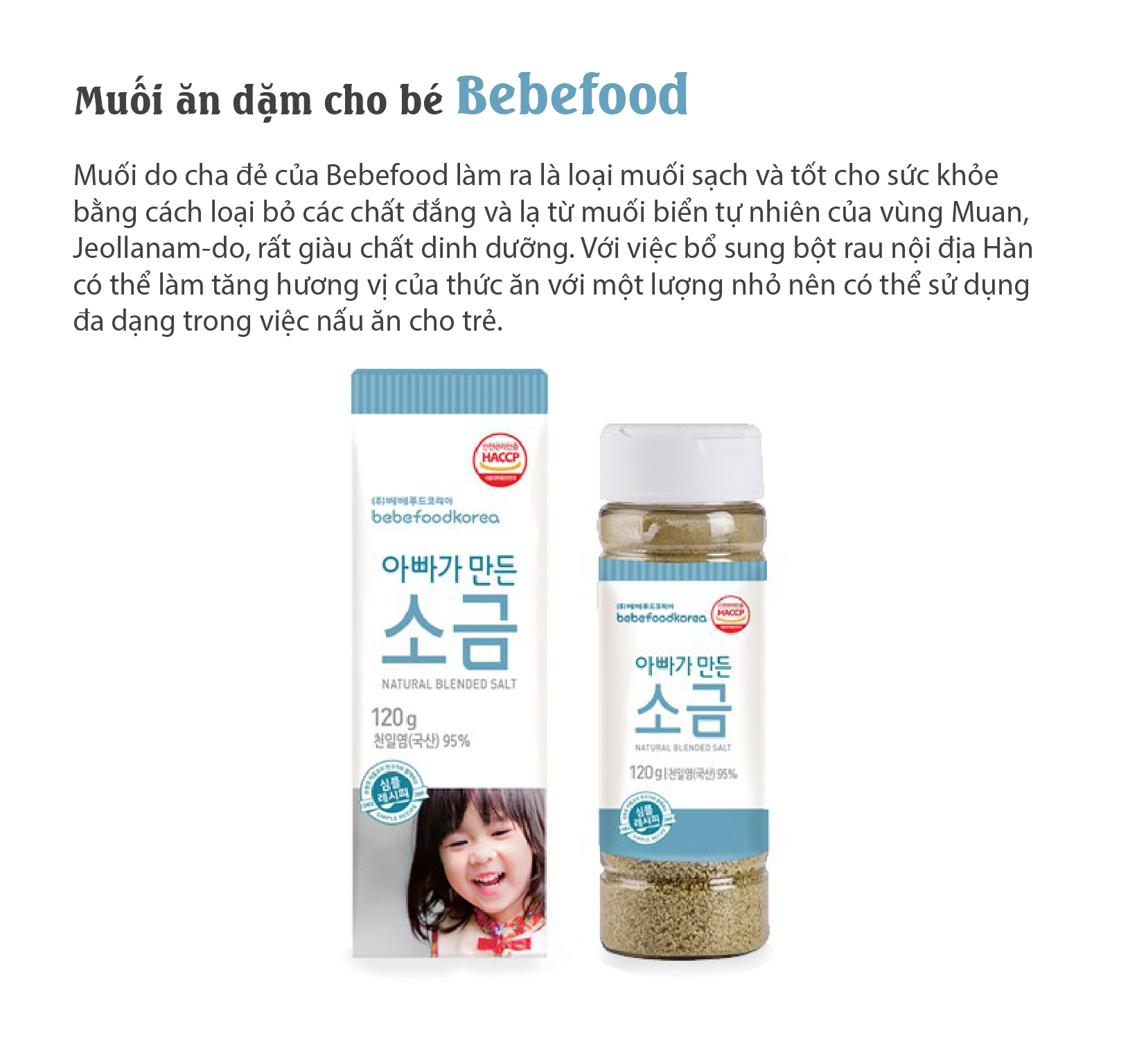 Muối ăn dặm cho bé Bebefood Hàn Quốc Muối do cha đẻ của Bebefood làm ra là loại muối sạch và tốt cho sức khỏe bằng cách loại bỏ các chất đắng và lạ từ muối biển tự nhiên của vùng Muan, Jeollanam-do, rất giàu chất dinh dưỡng. Với việc bổ sung bột rau nội địa Hàn có thể làm tăng hương vị của thức ăn với một lượng nhỏ nên có thể sử dụng đa dạng trong việc nấu ăn cho trẻ. Muối biển đã loại bỏ tạp chất Sản phẩm là một loại muối nhẹ và mềm bằng cách loại bỏ chất đắng và các chất lạ thông qua quá trình xử lý nhiệt.