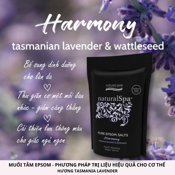 Harmony Epsom Salts - Với đặc tính thư giãn và làm dịu của hoa oải hương Tasmania và các đặc tính chống viêm được chiết xuất từ hạt keo Wattleseed đã tạo ra loại muối