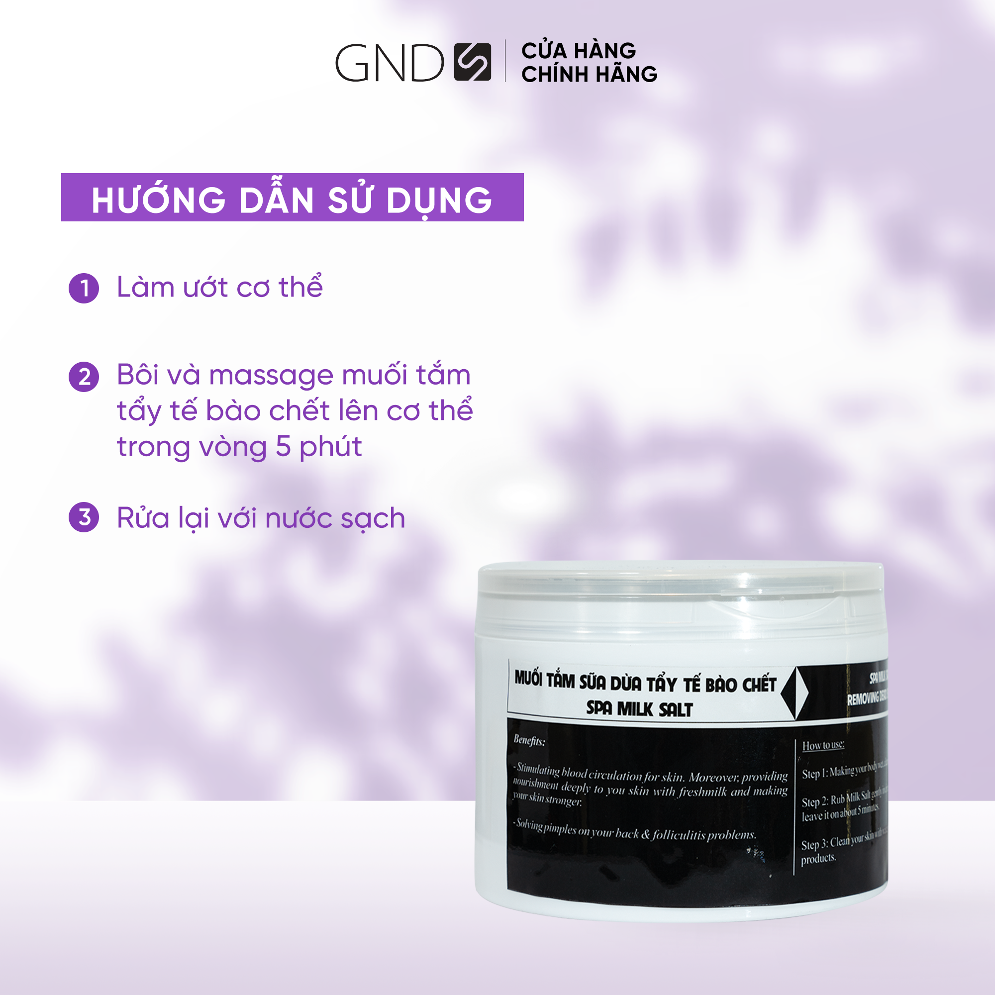 Mua tại TiktokMuối tắm tẩy tế bào chết sữa dừa GND 500g ĐỐI TƯỢNG SỬ DỤNG Phù hợp với mọi loại da THÀNH PHẦN CHÍNH: Muối, sữa dừa CÔNG DỤNG Loại bỏ tế bào chết Dưỡng da trắng mịn Cung cấp độ ẩm HƯỚNG DẪN SỬ DỤNG Bước 1: Làm ướt cơ thể Bước 2: Bôi và massage muối tắm tẩy tế bào chết lên cơ thể trong vòng 5 phút Bước 3: Rửa lại với nước sạch ƯU ĐIỂM NỔI BẬT Không gây bết rít
