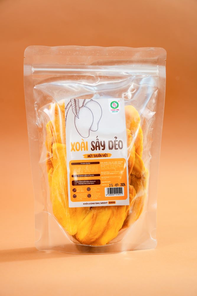 SẢN PHẨM CỦA HỘ KINH DOANH CƠ SỞ BÁNH MỨT THÀNH LONG 1 XOÀI SẤY DẺO Mứt Thuần Việt THÀNH PHẦN : : Trái xoài (80%), đường tinh luyện, muối i-ốt, chất bảo quản (E202), chất chống oxy hóa (E223), chất điều chỉnh độ acid: Acid tartaric (E334), màu thực phẩm tổng hợp: Sunset Yellow SẢN XUẤT THEO: 01/HKDCSBMTL1/2021 THỜI HẠN SỬ DỤNG : 06 Tháng kể từ ngày sản xuất CHỈ TIÊU CHẤT LƯỢNG : ĐỘ ẨM ≤ 35% HƯỚNG DẪN SỬ DỤNG VÀ BẢO QUẢN: HƯỚNG DẪN BẢO QUẢN: BẢO QUẢN NƠI KHÔ RÁO, THOÁNG MÁT. TRÁNH ÁNH NẮNG TRỰC TIẾP. NHIỆT ĐỘ THÍCH HỢP: 22 ĐỘ C - 30 ĐỘ C HƯỚNG DẪN SỬ DỤNG: DÙNG NGAY SAU KHI MỞ BAO BÌ. THÔNG TIN CẢNH BÁO: KHÔNG SỬ DỤNG SẢN PHẨM KHI ĐÃ HẾT HẠN SỬ DỤNG GIẤY CHỨNG NHẬN HACCP SỐ 21.4256 – HACCP/VC DO TRUNG TÂM GIÁM ĐỊNH VÀ CHỨNG NHẬN HỢP CHUẨN HỢP QUY VIETCERT ĐÁNH GIÁ CHỨNG NHẬN PHÙ HỢP TIÊU CHUẨN Chi tiết mẫu mã bao bì sản phẩm thay đổi theo từng lô hàng