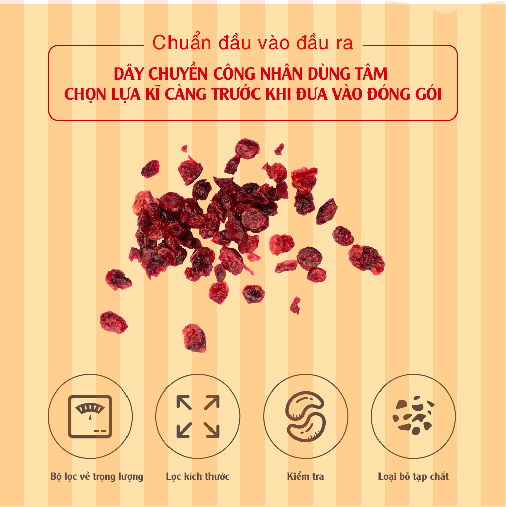 Thành phần Quả nam việt quất sấy khô (Cranberry) 100% nhập khẩu từ Mỹ Hướng dẫn sử dụng Ăn trực tiếp hoặc dùng làm nguyên liệu cho các món ăn khác như trộn salad, làm