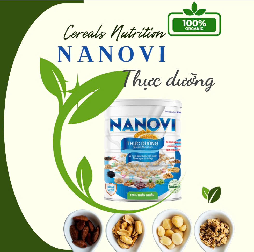 - Được sản xuất từ nguyên liệu sạch 100% Organic. ==> NANOVI THỰC DƯỠNG có thành phần gồm: yến mạch, gạo lức huyết rồng, đậu hà lan, đậu đen, đậu đỏ, mè đen và các loại hạt dinh dưỡng như: hạnh nhân, hạt óc chó nhập khẩu, hạt sen, hạt kê, hạt chia, ý dĩ, sachi,… 3.Công dụng: