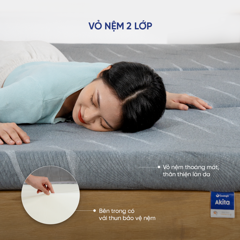 "Sản phẩm chỉ bán độc quyền trên kênh Online, TMĐT Vua Nệm" Nệm truyền thống quá cứng khiến bạn đau lưng? Bạn ngại đổi chỉ vì chúng gọn nhẹ, tiết kiệm chi phí và không gian? Vua Nệm cho ra mắt sản phẩm mới - Sự lựa chọn 2 trong 1 mang đến giấc ngủ vừa êm ái, vừa cải thiện cột sống lại tối ưu chi phí - không gian với thiết kế gấp 3 thông minh mang tên Goodnight Akita là lời giải đáp cho giấc ngủ ngon thật dễ dàng!   Hình thức đóng gói: Nệm cuộn trong thúng carton Chính sách bảo hành: 10 năm Lõi nệm: PU Foam  Lợi ích khi sử dụng nệm foam Goodnight Akita Đàn hồi êm ái cải thiện sức khỏe cột sống Goodnight Akita là dòng nệm foam Goodnight cải thiện hiệu quả tình trạng đau lưng, nhức mỏi nhờ sở hữu độ đàn hồi cao từ PU Foam. Chất liệu nệm Akita giúp giúp nâng đỡ trọn vẹn đường cong cơ thể, bảo vệ cột sống cân bằng, để cơ thể cảm nhận được sự mềm mại mà không lún trũng cho giấc ngủ thoải mái hàng đêm. Tiện lợi với thiết kế gấp 3 và chống trượt Là một trong số ít dòng nệm foam có thiết kế gấp 3, nệm Akita gọn nhẹ và tiện lợi tiện lợi cho việc vận chuyển và cất trữ, giúp tiết kiệm tối đa diện tích phòng ngủ và bảo quản dễ dàng hơn. Đáy nệm Akita được thiết kế bằng vải chống trượt, giữ cho nệm cố định phù hợp với gia đình có trẻ nhỏ; đồng thời chống mài mòn giúp gia tăng tuổi thọ cho sản phẩm. Gia tăng thoáng khí & kháng khuẩn vượt trội Nệm foam Goodnight Akita cho giấc ngủ khô thoáng và sạch khuẩn trong mọi thời tiết với lớp vải bọc kép. Áo nệm bên trong là vải thun với độ co giãn tốt để thông khí và bảo vệ lõi PU Foam. Vải ga ngoài Polyester dày dặn với lớp bông chần sát khuẩn được xử lý bằng công nghệ ép nhiệt, cho khả năng chống bụi khuẩn, thấm hút mồ hôi và bền bỉ tối ưu Bên cạnh đó, PU Foam tỷ trọng cao cũng hỗ trợ chống rung tốt, cung cấp sự thoải mái và riêng tư.     Nệm gấp gọn nhẹ và linh hoạt Xua tan nỗi lo mỗi khi chuyển nhà, nệm foam Goodnight có thể gấp lại làm ba và được hút cuộn chân không trong hộp nhỏ gọn nên rất tiện lợi cho việc vận chuyển và cất trữ. Nhờ công nghệ đặc biệt này mà sản phẩm tối ưu hơn các dòng nệm truyền thống, giúp tiết kiệm tối đa diện tích phòng ngủ và việc bảo quản cũng trở nên dễ dàng hơn.   Chế độ bảo hành Nệm foam Goodnight Akita được bảo hành chính hãng 10 năm.   Thương hiệu Goodnight - Đưa giấc ngủ trở về nguyên bản Nệm Goodnight - Đơn giản để ngủ ngon! Bỏ qua sự bối rối khi phải lựa chọn giữa vô vàn chiếc nệm khác nhau, đơn giản là đỉnh cao của sự chắt lọc và tinh tế, điều mà các chuyên gia của Goodnight đã chuẩn bị một cách tỉ mỉ nhất cho những khách hàng trân quý của mình. Mỗi sản phẩm Goodnight là một lời chúc ngủ ngon, một lời hứa cho giấc ngủ trọn vẹn nguyên bản. Hướng dẫn sử dụng và bảo quản