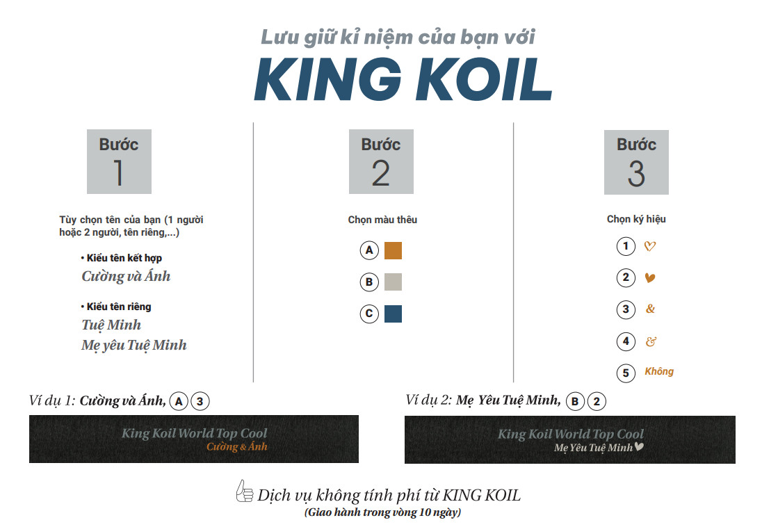 Đặc quyền cá nhân hoá: MIỄN PHÍ thêu tên/thông điệp lên chiếc nệm Hướng tới việc cá nhân hoá sản phẩm cho từng khách hàng khi mua nệm KingKoil tại hệ thống Thế Giới Nệm, chúng tôi dành tặng đặc quyền “thêu tên hoặc thông điệp lên tấm nệm King Koil World/ World Top/ World Top Cool” để khách hàng lưu trữ kỉ niệm hoặc thông điệp muốn gửi tặng cho người thương. Đây là dịch vụ hoàn toàn MIỄN PHÍ dành riêng cho khách hàng của Thế Giới Nệm. Cấu tạo của nệm lò xo King Koil