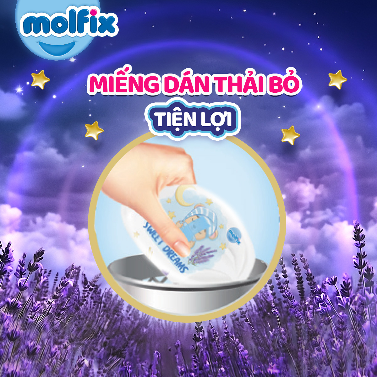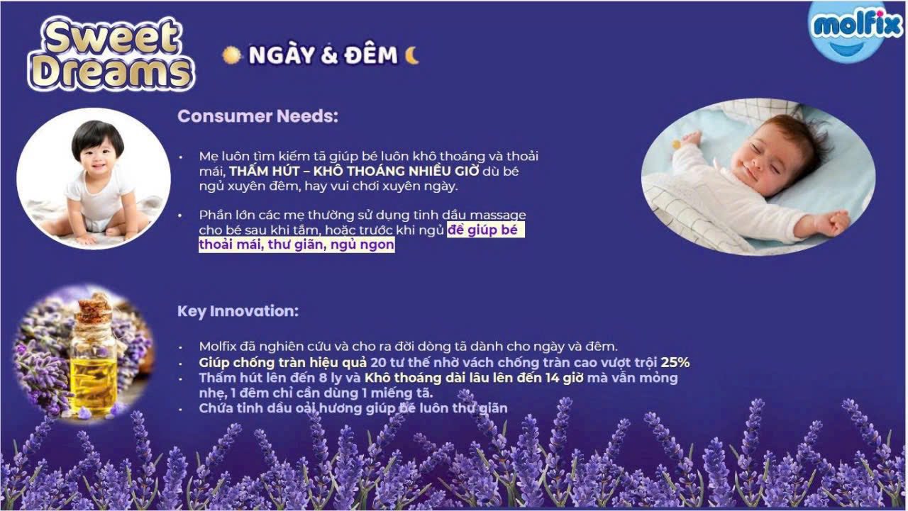 - TINH DẦU OẢI HƯƠNG - LIỆU PHÁP THƯ GIÃN Tã Molfix được bổ sung tinh dầu oải hương tự nhiên, mang đến hương thơm dịu nhẹ giúp bé thư giãn suốt cả ngày và đêm.