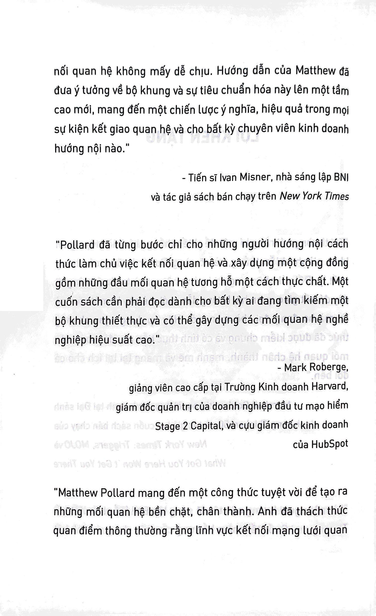 “Đây là bản kế hoạch về xây dựng mối quan hệ sẽ thay đổi cuộc đời bạn – một phương pháp đã được kiểm chứng do người đã thực sự thực hành nó viết nên. Nếu bạn đang tìm kiếm một hướng dẫn có thể thực hành xây dựng mối quan hệ hiệu quả và độc nhất, thì đây chính là nó đấy.” - Neil Patel, nhà đồng sáng lập NP Digital, nhân vật tạo ảnh hưởng hàng đầu theo bình chọn của Wall Street Journal, top 10 marketer theo bảng xếp hạng của Forbes