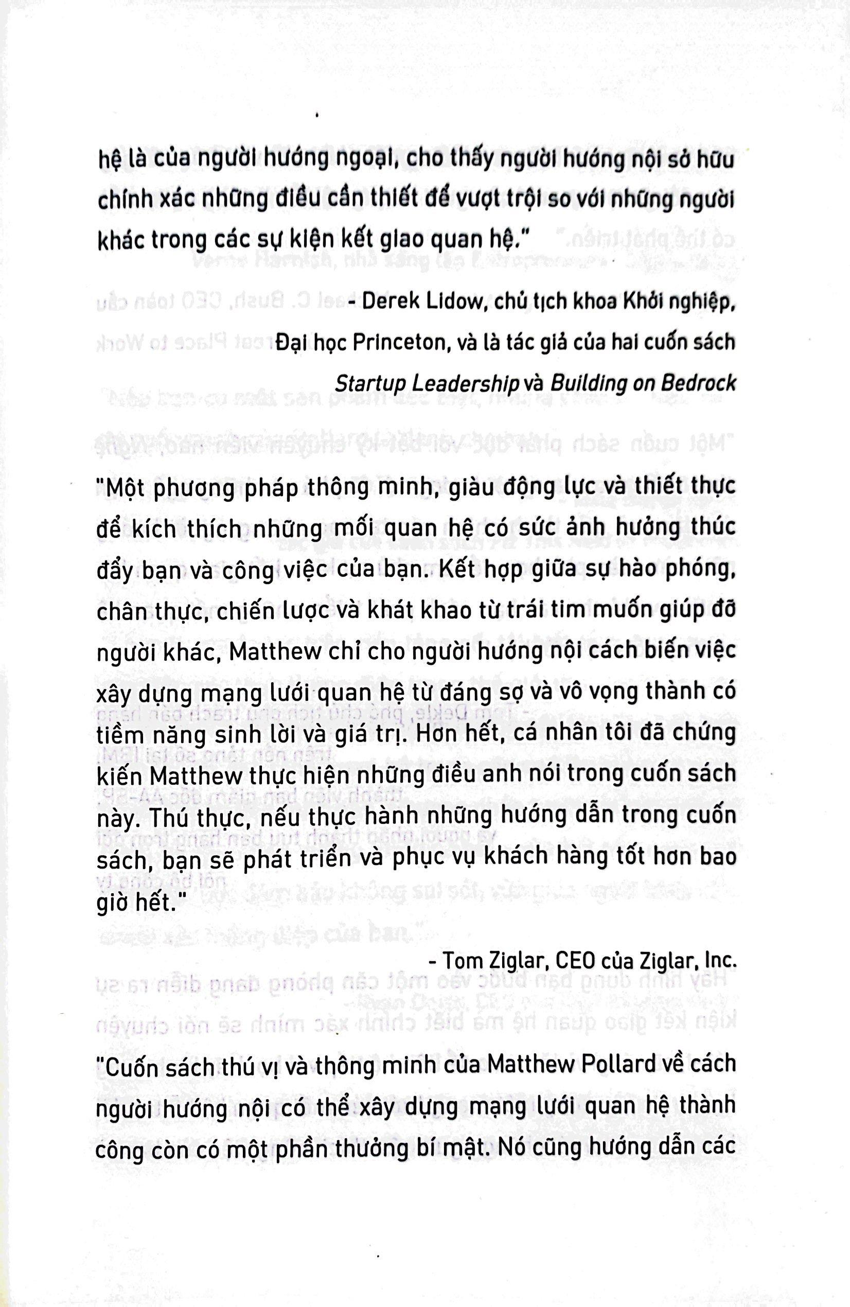“Matthew Pollard đang trở thành nhà chuyển đổi người hướng nội số 1 nước Mỹ. Tập trung vào giá trị của việc xây dựng mạng lưới quan hệ theo cách của người hướng nội, anh ấy mang đến cho bạn những ý tưởng và chiến lược để đánh bại những người hướng ngoại trong bất kỳ lĩnh vực nào.” - Jeffrey Gitomer, tác giả của Little Red Book of Selling
