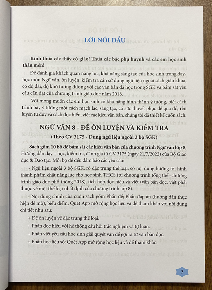 Sách gồm 10 bộ để bám sát các kiểu văn bản của chương trình Ngữ văn lớp 8, Hướng dẫn dạy – học, kiểm tra, đánh giá từ CV 3175 (ngày 21/7/2022) của Bộ Giáo dục & Đào tạo. Mỗi bộ để đều đảm bảo các yêu cầu: