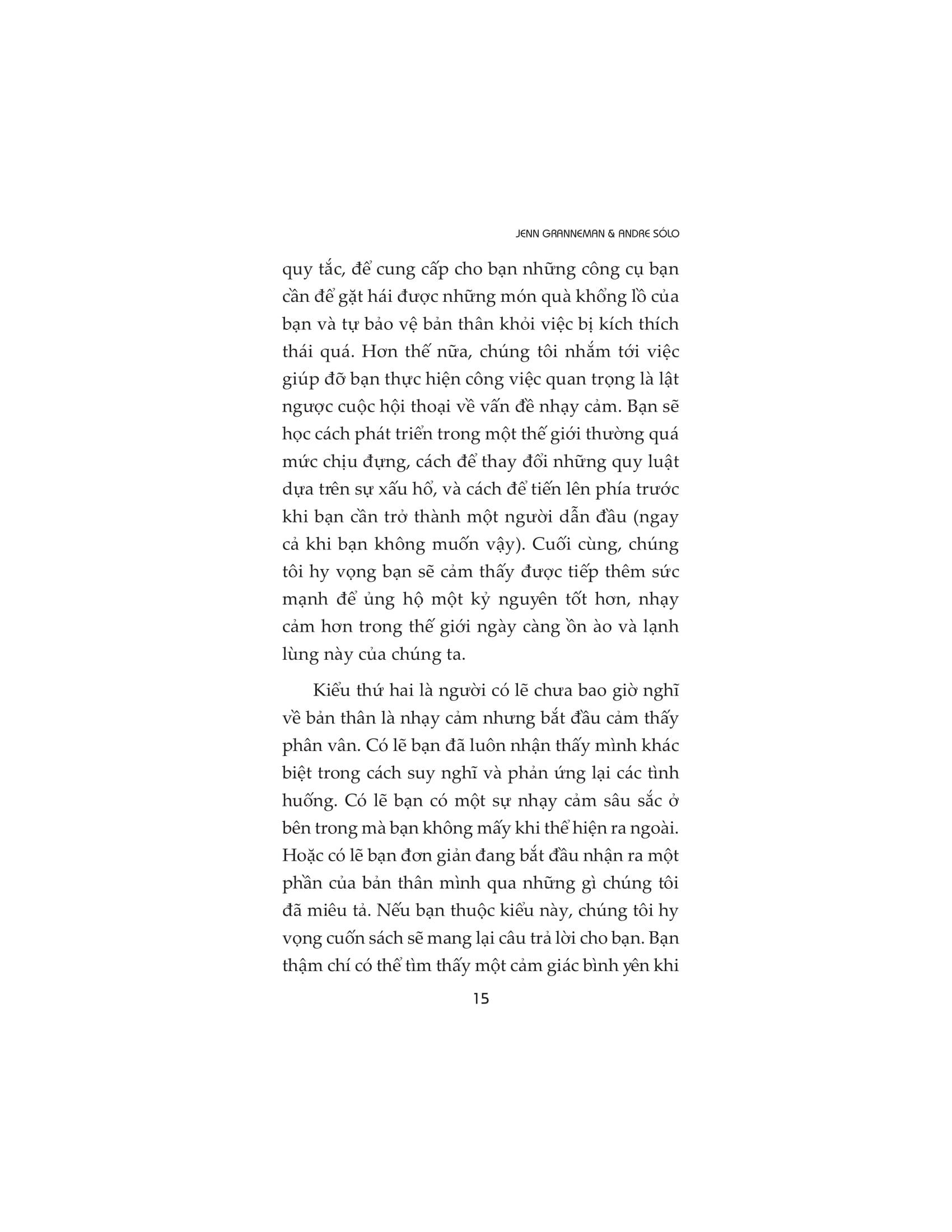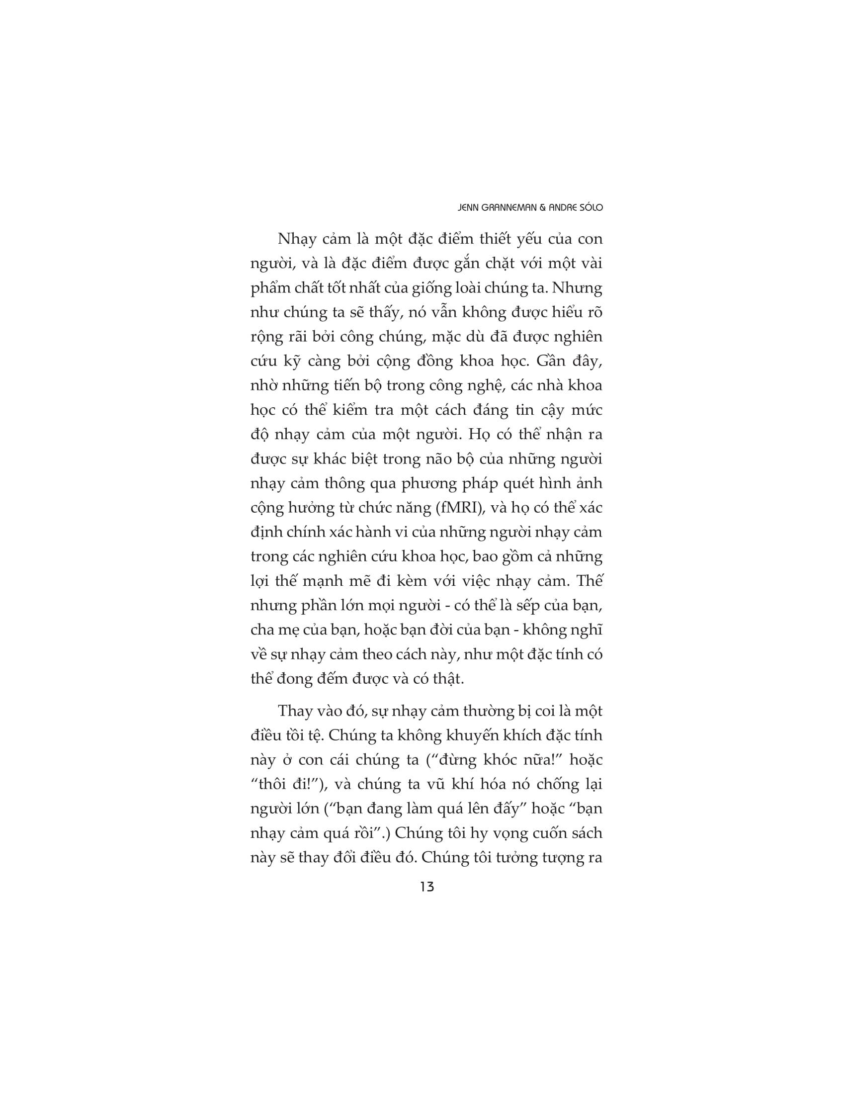Người Nhạy Cảm - Yếu Đuối Hay Năng Lực Người nhạy cảm là người có phản ứng mạnh mẽ với các kích thích từ môi trường xung quanh như cảm xúc, cử chỉ, lời nói của người khác và cả những suy nghĩ của chính bản thân họ. Nhạy cảm là một đặc điểm tính cách của con người, nhưng hiện nay, nó vẫn không được hiểu rõ rộng rãi bởi công chúng và sự nhạy cảm thường bị coi là một điều tồi tệ. Gần đây, nhờ những tiến bộ trong công nghệ, các nhà khoa học có thể kiểm tra mức độ nhạy cảm của một người và những lợi thế riêng mà người nhạy cảm sở hữu. Cuốn sách “Người nhạy cảm – yếu đuối hay năng lực” hướng dẫn cách khai thác sức mạnh tiềm ẩn của sự nhạy cảm và tận dụng nó trong các lĩnh vực quan trọng nhất của cuộc sống: tình bạn, các mối quan hệ nơi làm việc, khả năng lãnh đạo và nuôi dạy con cái. Thông qua những nghiên cứu thuyết phục và cách kể chuyện chuyên nghiệp, các tác giả cung cấp những công cụ và hiểu biết sâu sắc mà chúng ta cần để phát triển với tư cách là những người nhạy cảm trong một thế giới ồn ào và hối hả. Người nhạy cảm đều có quyền lựa chọn con đường riêng của họ. Nhưng có một bước mà tất cả chúng ta đều phải thực hiện và nó là bước khó khăn nhất: ngưng nhìn nhận sự nhạy cảm là một khiếm khuyết và bắt đầu coi nó là một món quà. Cuốn sách chứa đầy cảm hứng này sẽ thay đổi mãi mãi cách chúng ta nhìn nhận những người nhạy cảm và cách họ nhìn nhận chính m.ình. Về tác giả: Andre Solo là người đồng sáng lập và tổng biên tập của Sensitive Refuge - trang web lớn nhất thế giới dành cho những người nhạy cảm. Andre Solo là một diễn giả đầy nhiệt huyết chuyên diễn thuyết về chủ đề người nhạy cảm và khả năng lãnh đạo nhạy cảm. Jenn Granneman là một nhà giáo dục và một nhà báo, được giới thiệu trên NY Times, Washington Post, Oprah Daily, Guardian. Là tác giả của cuốn sách The secret lives of introverts.