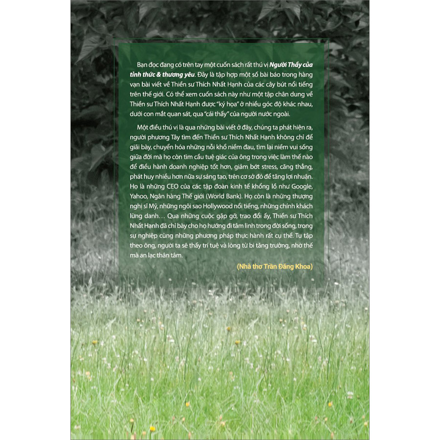 Đây là tập hợp một số bài báo trong hàng vạn bài viết về Thiền sư Thích Nhất Hạnh của các cây bút nổi tiếng trên thế giới. Có thể xem cuốn sách này như một tập chân dung về Thiền sư Thích Nhất Hạnh được "ký họa" ở nhiều góc độ khác nhau, dưới con mắt quan sát, qua "cái thấy" của người nước ngoài. Một điều thú vị là qua những bài viết ở đây, chúng ta phát hiện ra, người phương Tây tìm đến Thiền sư Thích Nhất Hạnh không chỉ để giãi bày, chuyển hóa những nỗi khổ niềm đau, tìm lại niềm vui sống giữa đời mà họ còn tìm cầu tuệ giác của ông trong việc làm thế nào để điều hành doanh nghiệp tốt hơn, giảm bớt stress, căng thẳng, phát huy nhiều hơn nữa sự sáng tạo, trên cơ sở đó để tăng lợi nhuận. Họ là những CEO của các tập đoàn kinh tế khổng lồ như Google, Yahoo, Ngân hàng Thế giới (World Bank). Họ còn là những thượng nghị sĩ Mỹ, những ngôi sao Hollywood nổi tiếng, những chính khách lừng Qua những cuộc gặp gỡ, trao đổi ấy, Thiền sư Thích Nhất Hạnh đã chỉ bày cho họ hướng đi tâm linh trong đời sống, trong sự nghiệp cùng những phương pháp thực hành rất cụ thể. Tu tập theo ông, người ta sẽ thấy trí tuệ và lòng từ bi tăng trưởng, nhờ thế mà an lạc thân tâm. (Nhà thơ Trần Đăng Khoa)