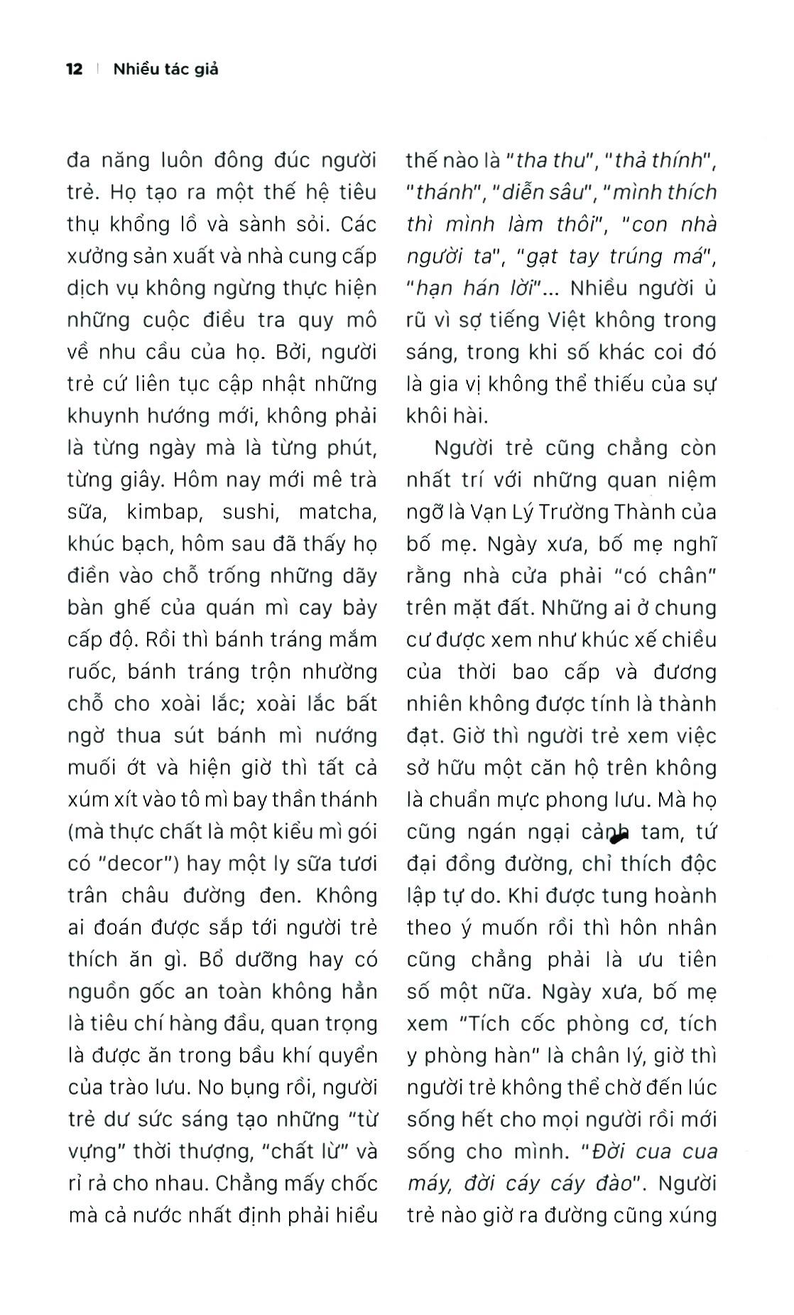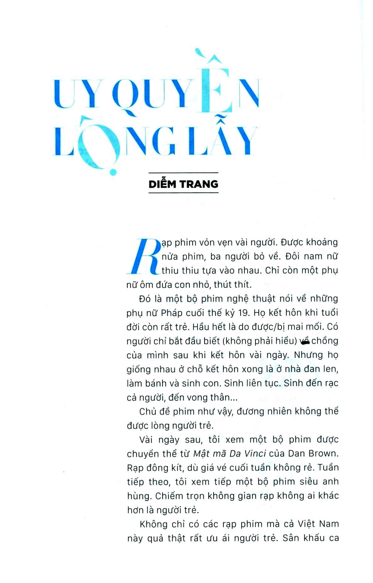 Nhiều tác giả Hồ Ngọc Đoan Khương, Trần Lê Hoa Tranh, Phương Dung, Diễm Trang, Thanh Vy, Hạnh Jiu, Kim Loan, Phương Thúy, Ngọc Huyền, Nguyễn Hồng Anh, Đoàn Khuyên, Hoàng Mai, Vũ Thị Thanh Tâm, Hạ Nguyên, Ngô Phương Từ. Người “suýt” trẻ nghĩ về người trẻ Mà người trẻ là ai vậy? Là những ai nhỏ hơn các đấng bậc trung niên và đã qua tuổi thanh thiếu niên. Là những ai đang tự hào đoan chắc mình là nhân vật chính trong mấy câu triết lý nhan nhản trên mạng kiểu “Tuổi thanh xuân giống như một cơn mưa rào, dù cho bạn từng bị cảm lạnh vì tắm mưa thì bạn vẫn muốn được đắm mình trong cơn mưa ấy lần nữa” hay “Không điên cuồng sao gọi là thanh xuân?”. Là những ai sáng vẫn ngủ nướng ngon lành nếu không phải đến lớp hoặc chỗ làm, trưa thèm bánh tráng trộn, trà sữa, tối thở dài vì thảm trạng FA (forever alone) và tối hôm sau lại khóc ướt gối vì thất tình hoặc vì được nhiều người vây bủa quá. Là những ai kè kè chiếc điện thoại dù thượng vàng hạ cám gì thì nhất định không được ngốc xít mà phải thông minh và vô Facebook được. Là những ai hừng hực khí thế xông pha vào tất thảy mọi sự trên đời. Và, là những ai nghĩ mình trẻ (như tôi chẳng hạn, ha ha!). Hay là thử phác thảo chân dung người trẻ thời 4.0 bằng một tập sách? Để chúng tôi hình dung, mô tả, nhận xét… về người trẻ Việt trong thời đại ăm ắp công nghệ và những biến động toàn cầu này liệu có khách quan không, có đầy đủ không? Chắc chắn là không. Nhưng tin rằng bức tranh người trẻ do chúng tôi họa nên có một dấu ấn riêng, trước hết vì nó được khởi nguồn từ chất liệu rất thật: tuổi trẻ của chính chúng tôi, say sưa kể câu chuyện của mình, lấy chính bản ngã của mình - từ chuyện ăn-đọc-họclàm-chơi đến chuyện ý thức, sức khỏe, đức tin, yêu đương, sai lầ - để đong đếm, đánh giá về người trẻ đương đại. Sài Gòn, 28/03/2019 Diễm Trang - Người trẻ cứ sai vì cuộc đời cho phép, cứ trả giá vì ngã rồi tự khắc lớn khôn thêm. - Nếu chúng ta quan niệm văn hóa dân gian như một không gian văn hóa truyền thống, phi chính thống, linh hoạt và tương thích với từng thời đại, thì sẽ không có gì là xộc xệch nếu chúng ta xếp mạng xã hội hay môi trường internet đương đại vào khung văn hóa dân gian cả - Đoạn tuyệt với lịch sử, với truyền thống sẽ tạo nên những công dân bơ vơ, mất ý thức về bản sắc - điều tạo nên căn cước của mỗi chúng ta trong thời đại hội nhập và toàn cầu hóa - Các độc giả hãy tận hưởng một kỷ nguyên thông tin đa sắc màu, hòa mình vào thế giới sống động ấy một cách khôn ngoan, không tự biến mình thành “con trâu” để bị xỏ mũi. - Đã xưa rồi cái thời muốn đi ăn, đi uống cà phê phải hỏi dò tìm quán, đi mua quần áo phải tới tận tiệm để thử đồ, đi chơi phải lên kế hoạch hàng mấy tháng trời hay có khi từ… năm trước. Bây giờ, chỉ cần một chiếc smartphone có kết nối mạng, bạn muốn gì cũng có và đi đâu cũng tới chỉ trong vòng một nốt nhạc. - Mỗi nơi các bạn đến, những trải nghiệm, những kiến thức và kinh nghiệm mà các bạn có được, thông qua mạng xã hội đã giúp cho mọi người gần nhau hơn, có thêm nhiều chọn lựa hơn cho những dự định và những mơ ước của chính mình. - Nylon và câu chuyện môi trường muôn thưở. Dẫu biết rằng muốn làm nên sự khác biệt có lúc cần phải quyết liệt và cực đoan, nhưng mình không phải là nhà hoạt động môi trường, mà chỉ lựa chọn điều chỉnh hành vi của bản thân sao cho thân thiện hơn với môi trường qua từng ngày. - Chúng ta có nhiều cách trưởng thành, du học là một trong những cách trưởng thành. Du học là chuyến đi lớn của cuộc đời, là cơ hội để các em trải nghiệm, vấp ngã, bước ra khỏi vùng an toàn và trưởng thành. - Trước đây, khi giáo dục còn mang tính ao làng, cái lớn nhất người du học đạt được là kiến thức. Nhưng bây giờ, cái quý nhất của một du học sinh là học được cách để làm mọi việc tốt nhất. Để mở cánh cửa này, người trẻ cần hai chìa khóa là ngoại ngữ và khả năng tự học tốt - Hãy tận dụng triệt để mọi cơ hội và phát huy nội lực của mình. Khi đó, ngoại cảnh lý tưởng sẽ mở ra trước mắt. Cơ hội dành cho tất cả, hãy chắc chắn là mình muốn và xách ba lô lên thôi! - Thực lòng, tôi thích phép thử và sai đó, hơn là bất kỳ sự lửng lơ nào. Dù sao thì khi ta sai, ta sẽ biết cách đối xử với tương lai bằng điều đúng đắn hơn. Đau khổ ư? Thì có gì đáng sợ? Ta chẳng phải đang có tuổi trẻ để chống đỡ lại rồi đó sao? - Tính dục là chuyện tự nhiên của con người từ khi đến tuổi dậy thì. Tôi đã đọc ở đâu đó sự xếp hạng các hành vi tính dục. Các nhà khoa học nói nhu cầu về tình dục trong con người cũng tự nhiên và cần thiết giống như các nhu cầu ăn, uống, ngủ nghỉ… Bởi vì nó tự nhiên, nó cần được diễ