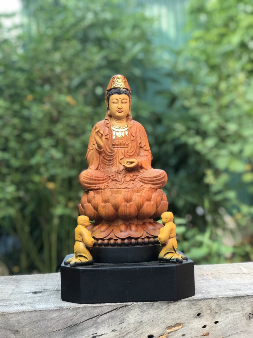 Tượng nhất tâm bái phật phật bà quan âm bồ tát được làm bằng chất liệu gỗ hương đá tự nhiên 100% Và được làm  tô mầu giả cổ  Kích thước cao 35×20×18cm _ Tượng nhất tâm bái phật bà quan âm bồ tát .Được trạm khắc tỉ mỉ tinh sảo kỳ công .Đi hầu hết mọi chi tiết đường nét nội dung hoa văn của tượng phật .Đều được chỉnh sửa ngọt tỉa lại hoàn toàn bằng tay thủ công .Đồng thời tượng phật được kiểm định rất kỹ lưỡng như cho vào thẩm sấy cho gỗ khô kiệt .Mục đích trống dập nứt vênh mo mối mọt .Kết hợp với trà nhám phun lót làm bóng mờ để giữ lại mầu sắc vân gỗ tự nhiên .Hay làm bóng tô mầu giả cổ như ảnh trên .Tùy theo cái gu sở thích tường người .Tượng phật nhất tâm bái phật được làm và hoàn thiệt do bàn tay khối óc tài hoa .Từ những người thợ giàu kinh nghiệm ũng như tay nghề cao trong làng nghề truyền thống .Chính vì thế tượng phật bà quan âm bồ tát đã đáp ứng đầy đủ những tiêu trí ( Đẹp bề rẻ ) Thẩm mỹ nghệ thuật với chất lượng tuyệt vời