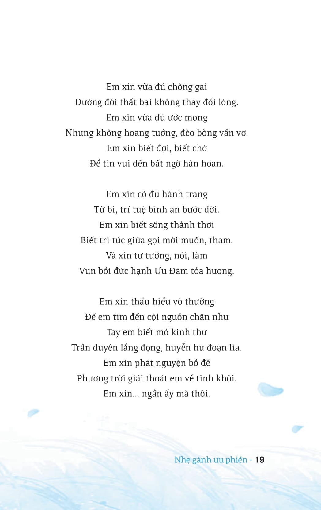 Nhẹ gánh ưu phiền là quyển sách thứ hai của tác giả Như Nhiên Thích Tánh Tuệ sau An nhiên giữa những thăng trầm. Với mong muốn tiếp tục góp thêm một đầu sách giúp quý độc giả vơi nhẹ gánh ưu phiền, tận hưởng niềm hạnh phúc, an lạc ngay trong từng hơi thở, tác giả tiếp tục tập hợp các bài văn, bài thơ vào cuốn sách thứ hai này nhằm truyền tải thông điệp chính: hạnh phúc không ở đâu xa xôi, hạnh phúc đang ở đây, ngay lúc này. Điều quan trọng là đôi mắt bạn có nhìn ra, trái tim bạn có cảm nhận được những niềm hạnh phúc ấy không. Đó cũng chính là giá trị và lợi ích thiết thực của sự tu tập trong Phật giáo. Tu không phải để ngày mai ngày kia sẽ hạnh phúc mà tu lúc nào là hạnh phúc ngay lúc đó.