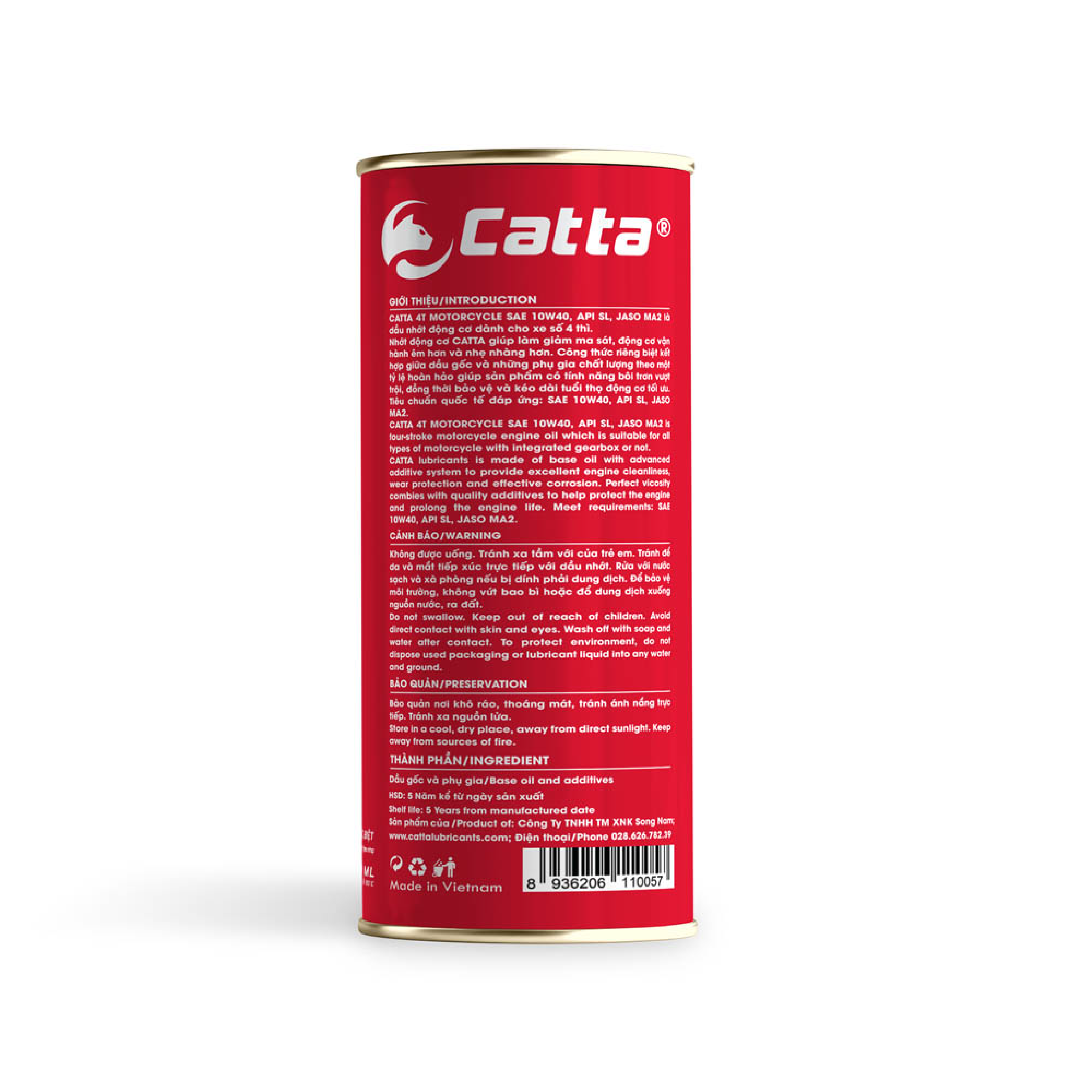DẦU NHỚT TỔNG HỢP TOÀN PHẦN CHO XE MÁY – CATTA MARS – 4T MOTORCYCLE SAE 10W40 – API SN – JASO MA2 – FULLY SYNTHETIC –  24/1L GIỚI THIỆU Dầu nhớt tổng hợp toàn phần cho xe máy 4T MOTORCYCLE SAE 10W40,  API SN, JASO MA2, Fully Synthetic 24/1L là dầu bôi trơn động cơ dành cho xe số 4 thì, được sản xuất từ nguồn nguyên liệu dầu nhớt tổng hợp toàn phần fully synthetic. Dầu nhớt tổng hợp toàn phần CATTA MARS giúp làm giảm ma sát, động cơ vận hành êm hơn và nhẹ nhàng hơn. Công thức riêng biệt kết hợp giữa dầu gốc và những phụ gia chất lượng theo một tỷ lệ hoàn hảo giúp sản phẩm có tính năng bôi trơn vượt trội, đồng thời bảo vệ và kéo dài tuổi thọ động cơ tối ưu. Sản phẩm dầu nhớt Catta được sản xuất từ nguyên liệu nhập khẩu hoàn toàn trên dây chuyền công nghệ hiện đại, đội ngũ kỹ thuật tận tâm và nhà máy đạt chứng nhận ISO 9001:2018. Tiêu chuẩn quốc tế đáp ứng: