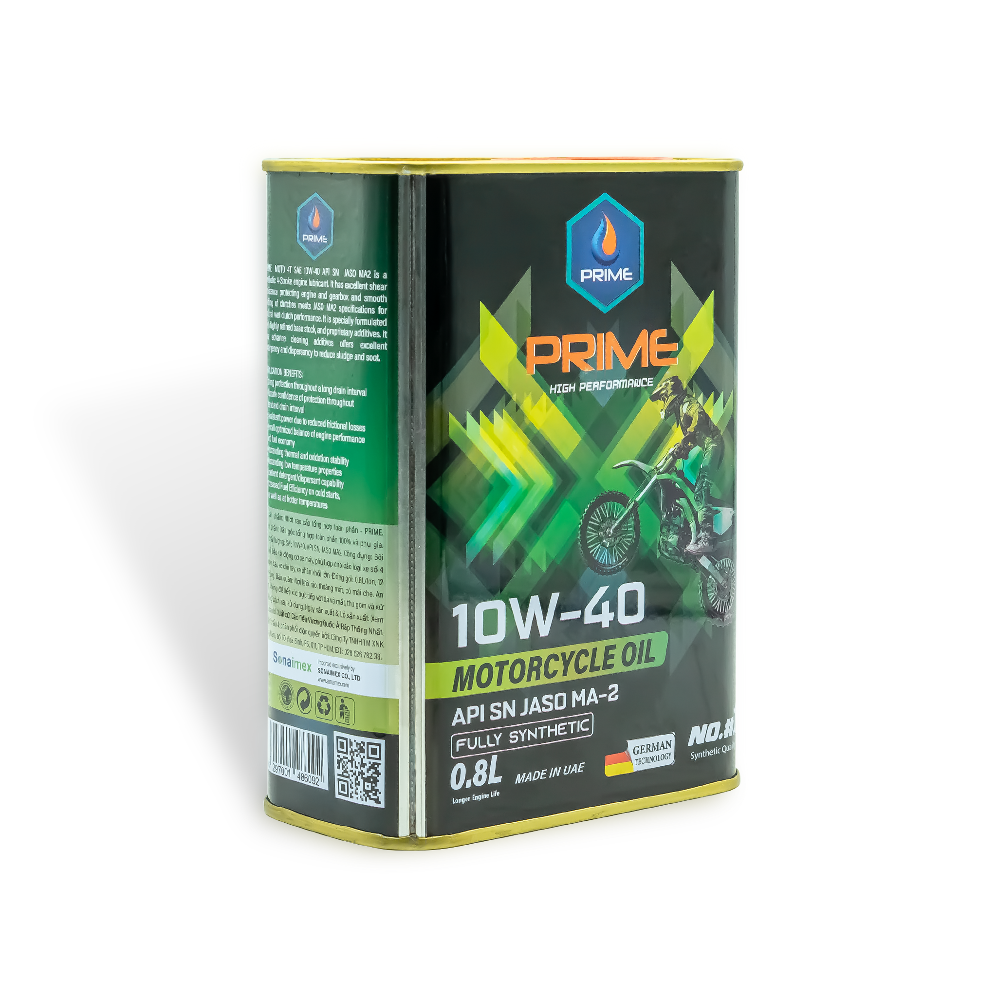 NHỚT TỔNG HỢP TOÀN PHẦN PRIME SAE 10W40, API SN, JASO MA2, FULLY SYNTHETIC LON 800ML NHẬP KHẨU 100%, CÔNG NGHỆ SẢN XUẤT ĐỨC