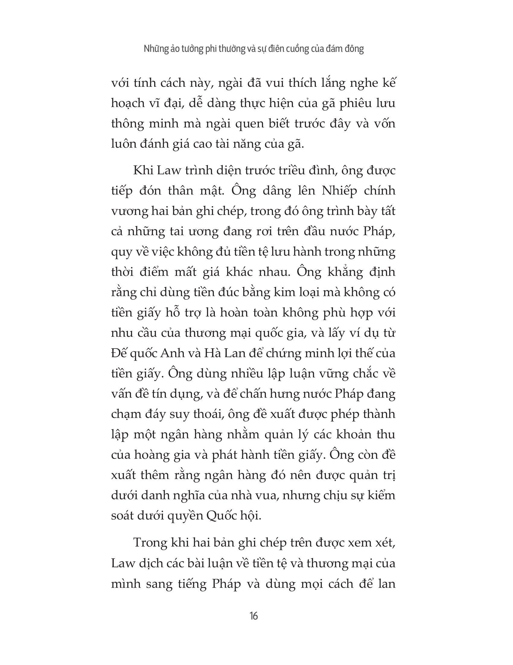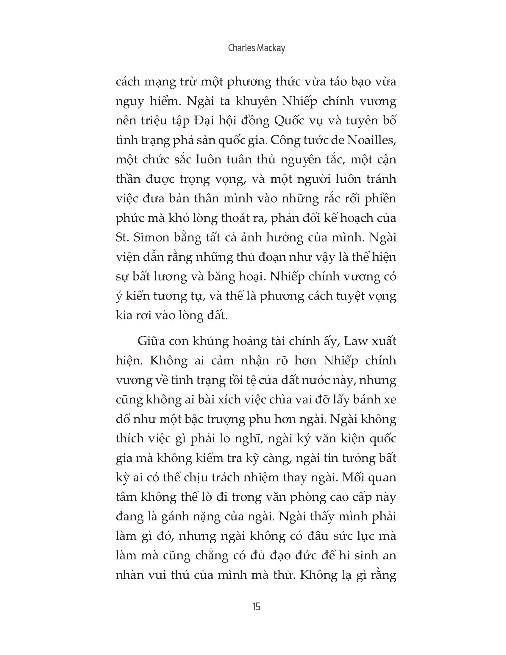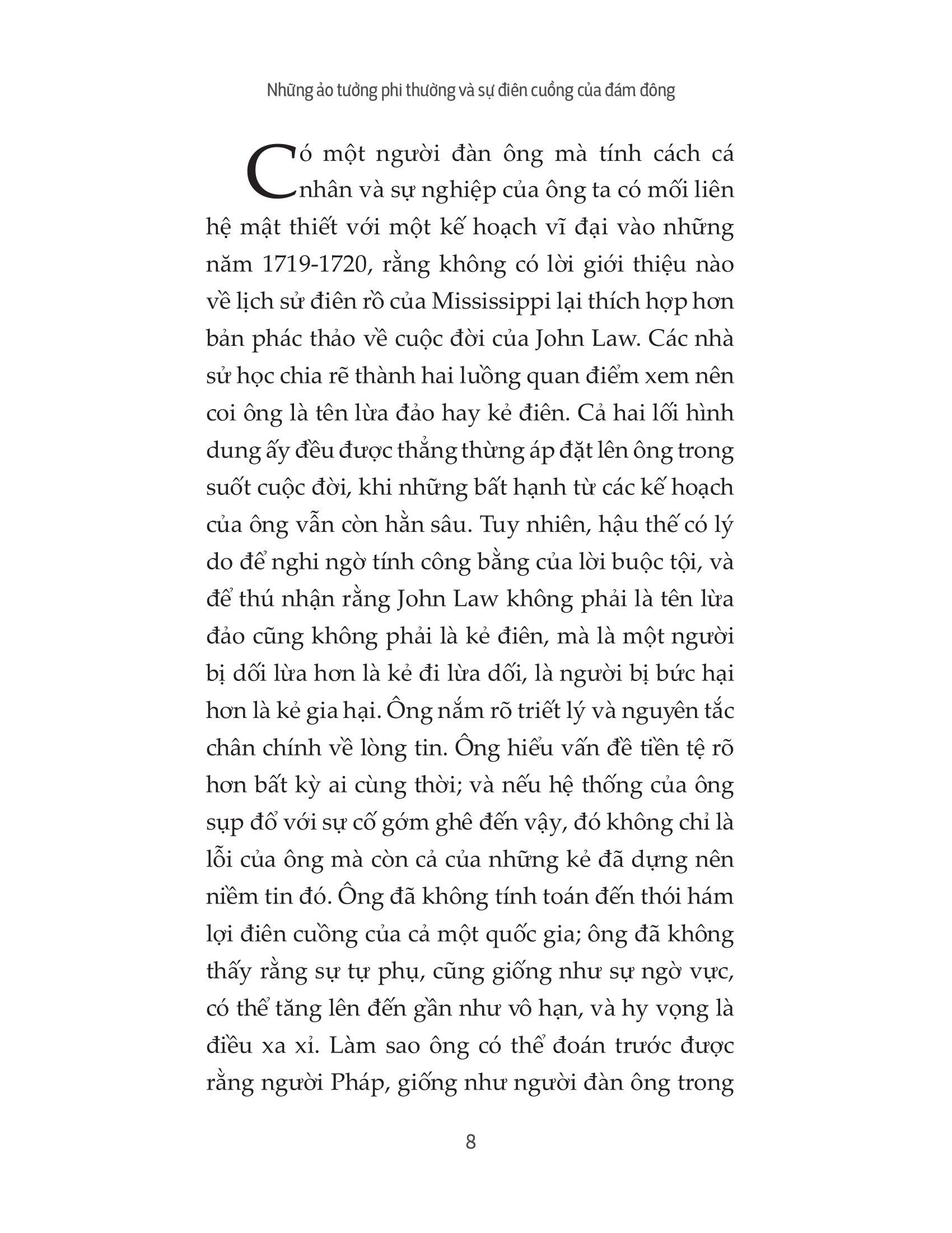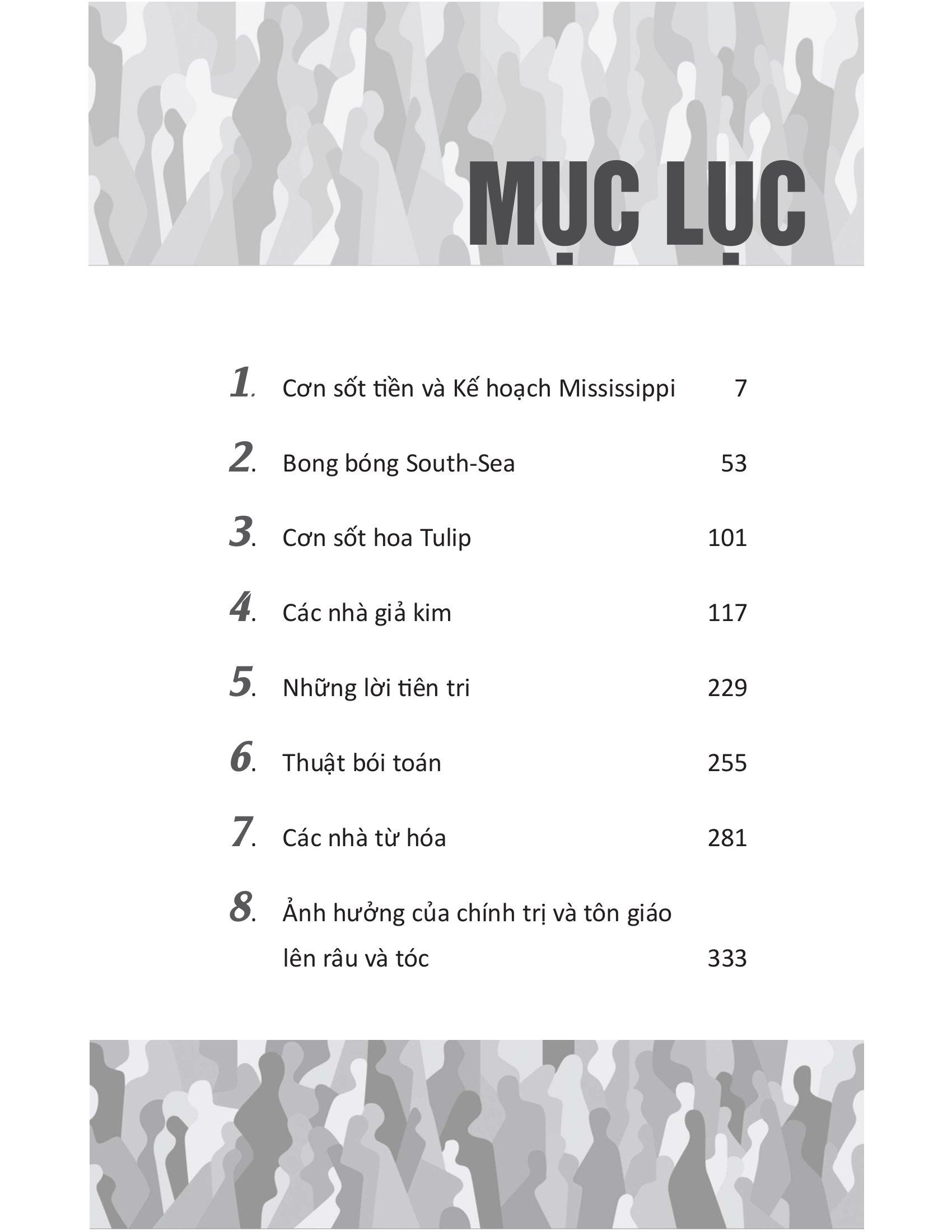 Những Ảo Tưởng Phi Thường Và Sự Điên Cuồng Của Đám Đông Xuất bản lần đầu vào năm 1841, cuốn sách “Những ảo tưởng phi thường và sự điên cuồng của đám đông” được coi là cuốn sách hay nhất từng viết về tâm lý thị trường. Đặc biệt, các chương về ba cơn cuồng tài chính khét tiếng - Kế hoạch Mississipi của John Law, Bong bóng South-Sea và Cơn sốt hoa Tulip. Khi viết về lịch sử của những cơn cuồng tài chính vĩ đại, Charles Mackay đã chứng tỏ m.ình là một nhà biên niên sử bậc thầy về lịch sử xã hội cũng như tài chính. Tác giả đã tạo ra một cuốn sách vừa là một bộ phim kinh dị hấp dẫn vừa là một tài liệu lịch sử hấp dẫn. Charles Mackay đã giải mã những giai đoạn lịch sử “mất trí” vì lòng tham và nỗi sợ hãi của nhân loại, cách những kẻ thao túng thị trường tài chính lợi dụng sự cả tin và tham lam của “con mồi” trước sự hấp dẫn mê hoặc của “cơn sốt loạn trí” đang tràn lan phổ biến. Các sự kiện thực tế trong cuốn sách này là cơ sở để nghiên cứu về động lực học và tâm lý học đám đông. Cuốn sách giúp chúng ta hiểu được tâm trí phổ biến của con người được thiết lập trong một cơn hưng cảm. Đây là cuốn sách đầu tiên mà bất kỳ ai đầu tư vào các công cụ tài chính, đặc biệt là cổ phiếu nên đọc. Nó cung cấp những quan điểm hành vi, giải thích lý do tại sao mọi người làm những gì họ làm. Cuốn sách chứa đầy những điều điên rồ và đưa ra một bài học quan trọng cho các nhà đầu tư: cẩn thận với sóng, hưng cảm và bong bóng. Về tác giả: Charles Mackay là một nhà thơ, nhà báo, tiểu thuyết gia người Scotland, nổi tiếng chủ yếu nhờ cuốn sách Những ảo tưởng phi thường và sự điên cuồng của đám đông. Ông là nhà báo có tiếng ở London. Năm 1834, ông đóng góp cho tờ The Sun. Từ mùa xuân năm 1835 đến năm 1844, ông là trợ lý biên tập phụ của Morning Chronicle. Vào mùa thu năm 1844, ông chuyển đến Scotland và trở thành biên tập viên của Glasgow Argus, từ chức vào năm 1847. Ông là phóng viên của The Times trong Nội chiến Hoa Kỳ, nhưng sau đó dồn tâm sức để tập trung vào viết sách. Ông là bạn của những nhân vật nổi tiếng như Charles Dickens và Henry Russell.