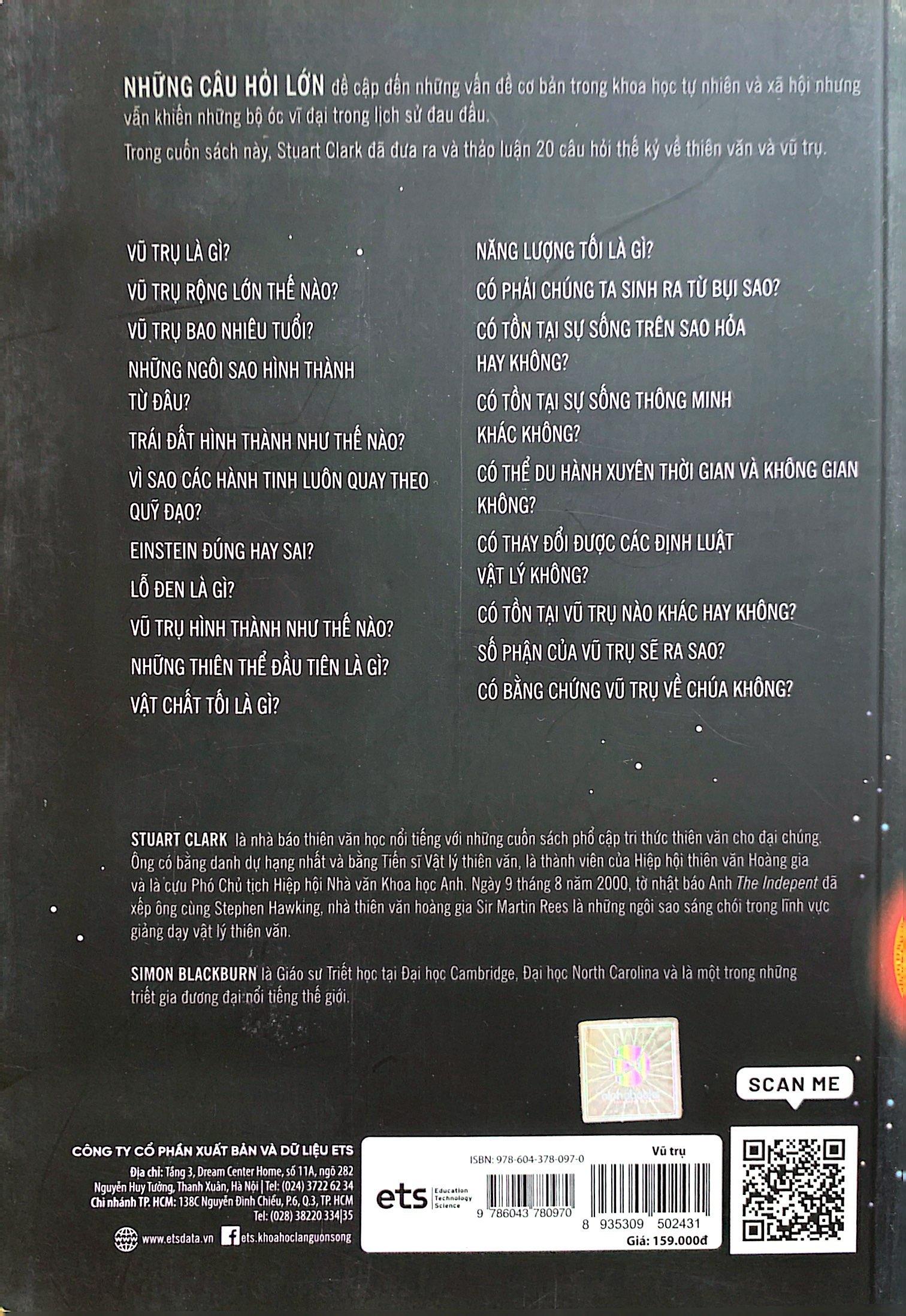 NHỮNG CÂU HỎI LỚN đề cập đến những vấn đề cơ bản trong khoa học tự nhiên và xã hội, nhưng vẫn khiến những bộ óc vĩ đại trong lịch sử đau đầu. Trong cuốn sách này, Stuart Clark đã đưa ra và thảo luận 20 câu hỏi thế kỷ về thiên văn và vũ trụ. vũ trụ là gì? vũ trụ rộng lớn thế nào? vũ trụ bao nhiêu tuổi? những ngôi sao hình thành từ đâu? trái đất hình thành như thế nào? vì sao các hành tinh luôn bay theo quỹ đạo? einstein đúng hay sai? lỗ đen là gì? vũ trụ hình thành như thế nào? những thiên thể đầu tiên là gì? năng lượng tối là gì? có phải chúng ta hình thành từ bụi sao? trên sao hỏa có sự sống hay không? có những trí tuệ nào đang tồn tại? chúng ta có thể du hành thời gian và không gian không? có thể thay đổi các định luật vật lý không? có vũ trụ thay thế hay không? số phận của vũ trụ sẽ ra sao? có bằng chứng nào cho thấy vũ trụ là do chúa? Về tác giả: STUART CLARK là nhà thiên văn học nổi tiếng với những cuốn sách phổ cập tri thức thiên văn cho đại chúng. Ông có bằng danh dự hạng nhất và bằng Tiến sĩ Vật lý thiên văn, là thành viên của Hiệp hội thiên văn Hoàng gia và là cựu Phó Chủ tịch Hiệp hội Nhà văn Khoa học Anh. Ngày 9 tháng 8 năm 2000, tờ nhật báo Anh The Indepent đã xếp ông cùng Stephen Hawking, nhà thiên văn hoàng gia Sir Martin Rees là những ngôi sao sáng chói trong lĩnh vực giảng dạy vật lý thiên văn. SIMON BLACKBURN là Giáo sư Triết học tại Đại học Cambridge, Đại học North Carolina và là một trong những triết gia đương đại nổi tiếng trên thế giới.