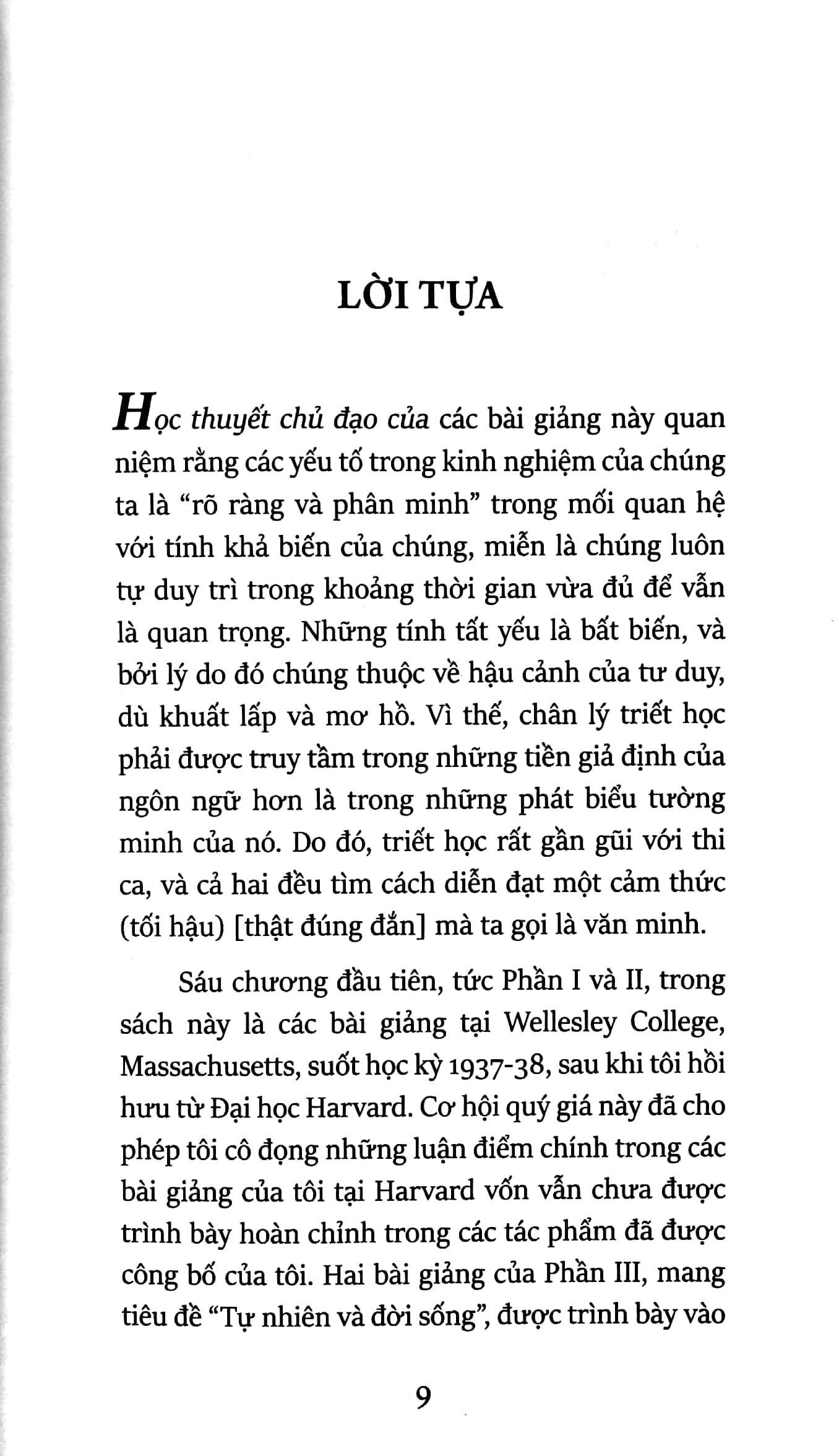 Học thuyết chủ đạo của các bài giảng này quan niệm rằng các yếu tố trong kinh nghiệm của chúng ta là “rõ ràng và phân minh” trong mối quan hệ với tính khả biến của chúng, miễn là chúng luôn tự duy trì trong khoảng thời gian vừa đủ để vẫn là quan trọng. Những tính tất yếu là bất biến, và bởi lý do đó chúng thuộc về hậu cảnh của tư duy, dù khuất lấp và mơ hồ. Vì thế, chân lý triết học phải được truy tầm trong những tiền giả định của ngôn ngữ hơn là trong những phát biểu tường minh của nó. Do đó, triết học rất gần gũi với thi ca, và cả hai đều tìm cách diễn đạt một cảm thức (tối hậu) [thật đúng đắn] mà ta gọi là văn minh.