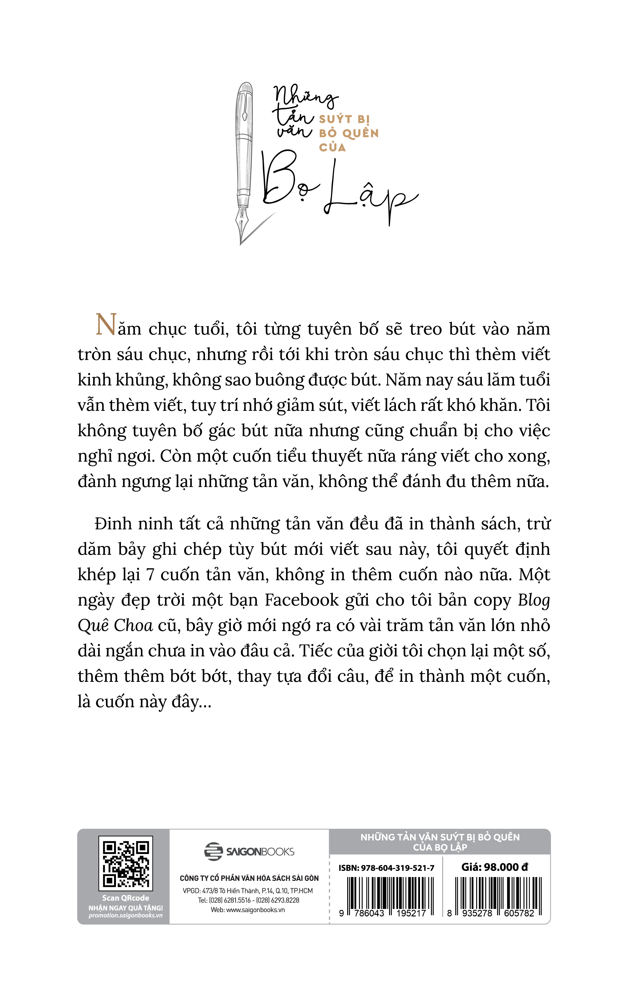 Năm chục tuổi, tôi từng tuyên bố sẽ treo bút vào năm tròn sáu chục, nhưng rồi tới khi tròn sáu chục thì thèm viết kinh khủng, không sao buông được bút. Năm nay sáu lăm tuổi vẫn thèm viết, tuy trí nhớ giảm sút, viết lách rất khó khăn. Tôi không tuyên bố gác bút nữa nhưng cũng chuẩn bị cho việc nghỉ ngơi. Còn một cuốn tiểu thuyết nữa ráng viết cho xong, đành ngưng lại những tản văn, không thể đánh đu thêm nữa. Đinh ninh tất cả những tản văn đều đã in thành sách, trừ dăm bảy ghi chép tùy bút mới viết sau này, tôi quyết định khép lại 7 cuốn tản văn, không in thêm cuốn nào nữa. Một ngày đẹp trời một bạn gửi cho tôi bản copy Blog Quê Choa cũ, bây giờ mới ngớ ra có vài trăm tản văn lớn nhỏ dài ngắn chưa in vào đâu cả. Tiếc của giời tôi chọn lại một số, thêm thêm bớt bớt, thay tựa đổi câu, để in thành một cuốn, là cuốn này đây. Cũng trong cuốn này xin được gửi kèm một chút phê bình, một chút thôi, để khoe với mọi người ông bọ cũng biết viết phê bình. Tôi định đặt tựa là “Những tản văn còn sót lại của Bọ Lập” nhưng sợ bị huông nên đổi lại thành “Những tản văn suýt bị bỏ quên của Bọ Lập”, nó đúng là suýt bị bỏ quên thật. Nay kính cẩn gởi tới bạn đọc với lòng biết ơn sâu sắc những ai luôn dõi theo suốt bốn mươi năm văn chương có lẻ đủ mùi hỉ nộ ái ố của cuộc đời tôi. - Nguyễn Quang Lập TRÍCH ĐOẠN HAY TRONG SÁCH “NHỮNG TẢN VĂN SUÝT BỊ BỎ QUÊN CỦA BỌ LẬP”: “Và lạnh. Mùa đông sương sớm lạnh giá, cái lạnh rin rín nước. Mùa đông mưa lạnh buốt, cái lạnh sũng nước. Không như sương không như mưa, mưa phùn man mát lành lạnh, cái lạnh thanh thanh. Mưa phùn đủ lạnh để cho ta khi cầm tay nhau, áp vào má nhau, sà vào lòng bỗng thấy ấm áp lạ thường. Mưa phùn là vậy đó nhưng chỉ có ở Hà Nội mới cảm được hết, không biết vì sao. Có lẽ mưa phùn ở đây ít bị pha tạp bởi sương mù, gió bấc. Cũng có thể Hà Nội hợp với mưa phùn, tưởng động mà tĩnh, tưởng lạnh mà mát, lặng lẽ nhẹ nhàng không hề vướng víu tiếng ồn như người Hà Nội (Là nói người Hà Nội Đông Đô, Hà Nội Kẻ Chợ). Mới hiểu vì sao ở đâu cũng thích mưa phùn, thích nhất vẫn là người Hà Nội.”
