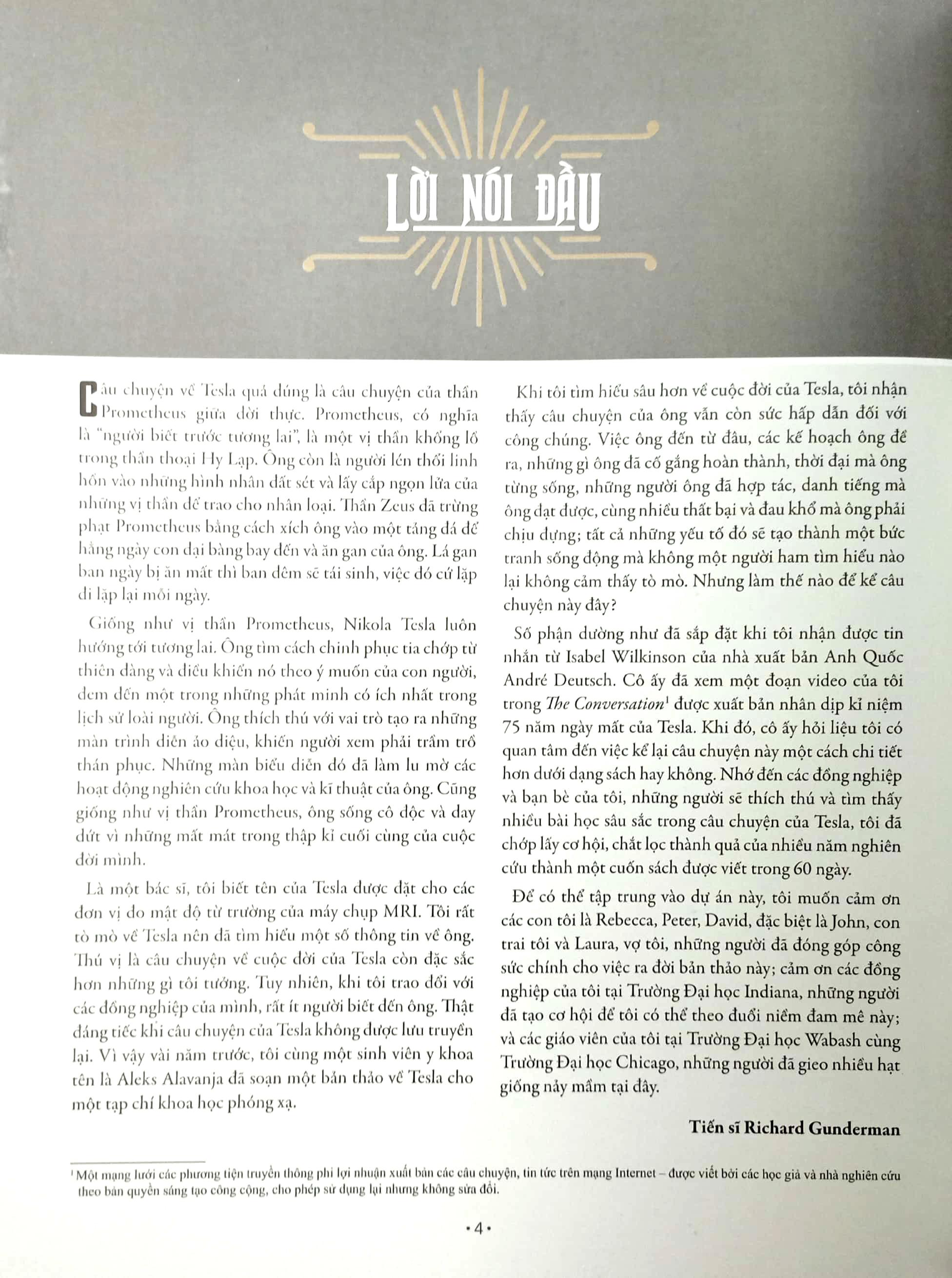 Được ca tụng là cha đẻ của dòng điện xoay chiều, Nikola Tesla đã làm thay đổi thế giới với các phát minh của mình. Nhà khoa học này đã cống hiến toàn bộ cuộc đời mình cho việc nghiên cứu, khám phá, phát minh với hơn 700 bằng sáng chế thuộc về ông. Ngay từ thuở ấu thơ, tâm trí của Tesla đã tràn ngập những suy nghĩ thách thức khoa học, khi trưởng thành, ông phân tích những giải pháp, phát minh ở mức độ vô cùng chi tiết để lý giải chúng, đồng thời tự phát triển những nguyên lý, lý thuyết mới định hình lại tương lai của khoa học. Từ tia X, ra-đa đến cuộn dây Tesla, radio, điều khiển từ xa, cuốn tiểu sử với 150 bức ảnh minh họa tuyệt đẹp này sẽ cho độc giả thấy được sự phát triển trong các lý thuyết chính và phát minh của Tesla. Cuốn sách làm sáng tỏ những góc tối trong cuộc đời riêng tư và sự nghiệp của nhà phát minh đại tài, người đã sống một cuộc đời lập dị và cô độc, dù đã đóng góp đáng kể cho văn minh nhân loại. Tesla bao gồm những bức vẽ, lá thư, nhật kí, ghi chép hiếm hoi của Tesla, cùng với những bức ảnh chụp ông, tất cả tạo nên bức chân dung hoàn chỉnh về một trí tuệ vĩ đại trong lịch sử.